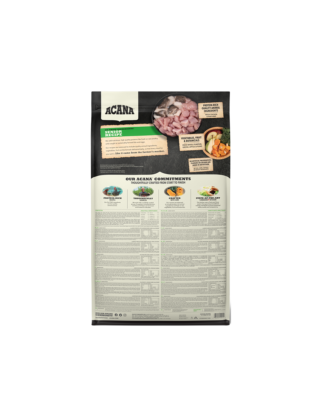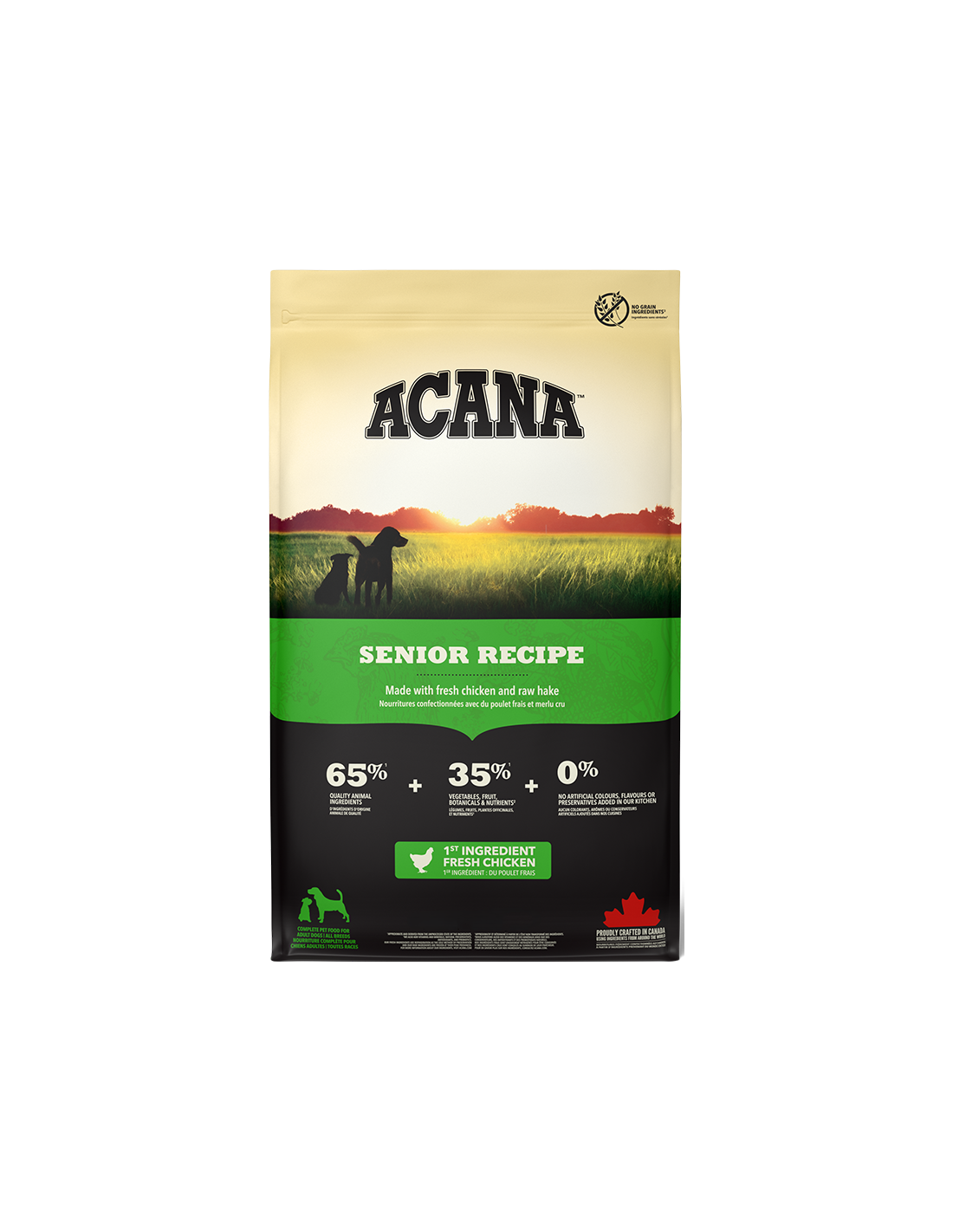 ACANA Senior conté nivells més alts de proteïnes procedents de pollastre criat en llibertat, palaia salvatge i ous frescos de corral, incloent carn, òrgans, cartílag i os, proporcionant tots els nutrients necessaris per mantenir uns músculs i ossos forts.