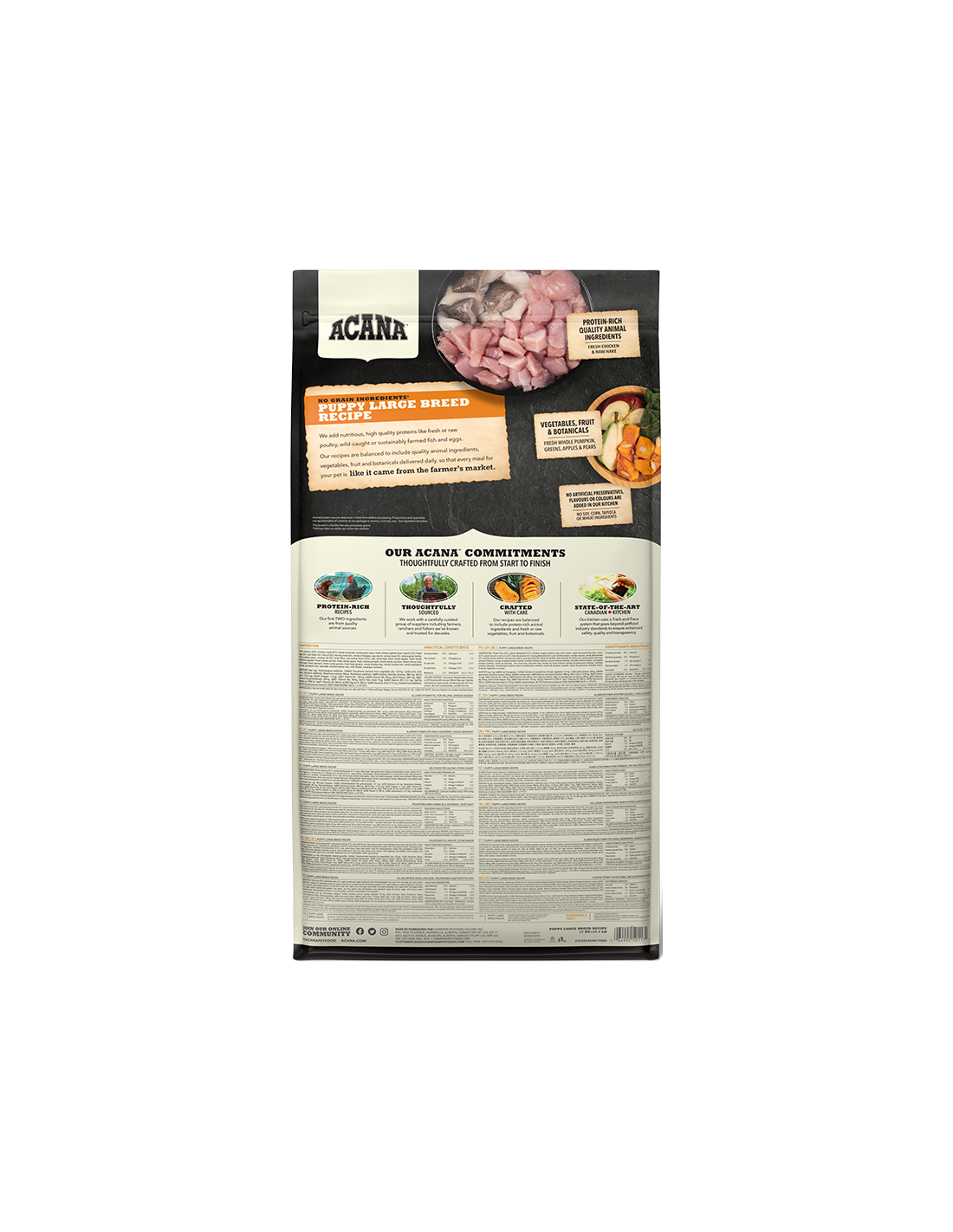 Sense cereals ni hidrats de carboni d’absorció ràpida com els de l’arròs, la tapioca o la patata, ACANA aquesta recepta està plena de pollastre de corral i palaia salvatge, incloent carn, òrgans, cartílag i os, així com ous frescos de corral per oferir a aquests cadells en creixement una dieta completa amb tot el que necessiten per créixer sans, feliços i forts.