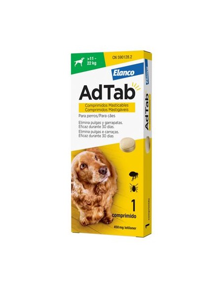 AdTab és un medicament veterinari que proporciona una acció immediata i persistent durant un 1 mes d'eliminació de puces (Ctenocephalides felis i C. canis) i paparres (Rhipicephalus sanguineus, Ixodes ricinus, I. hexagonus i Dermacentor reticulatus). Està indicat per a gossos de 8 setmanes d'edat o més i 1,3 kg de pes o més.