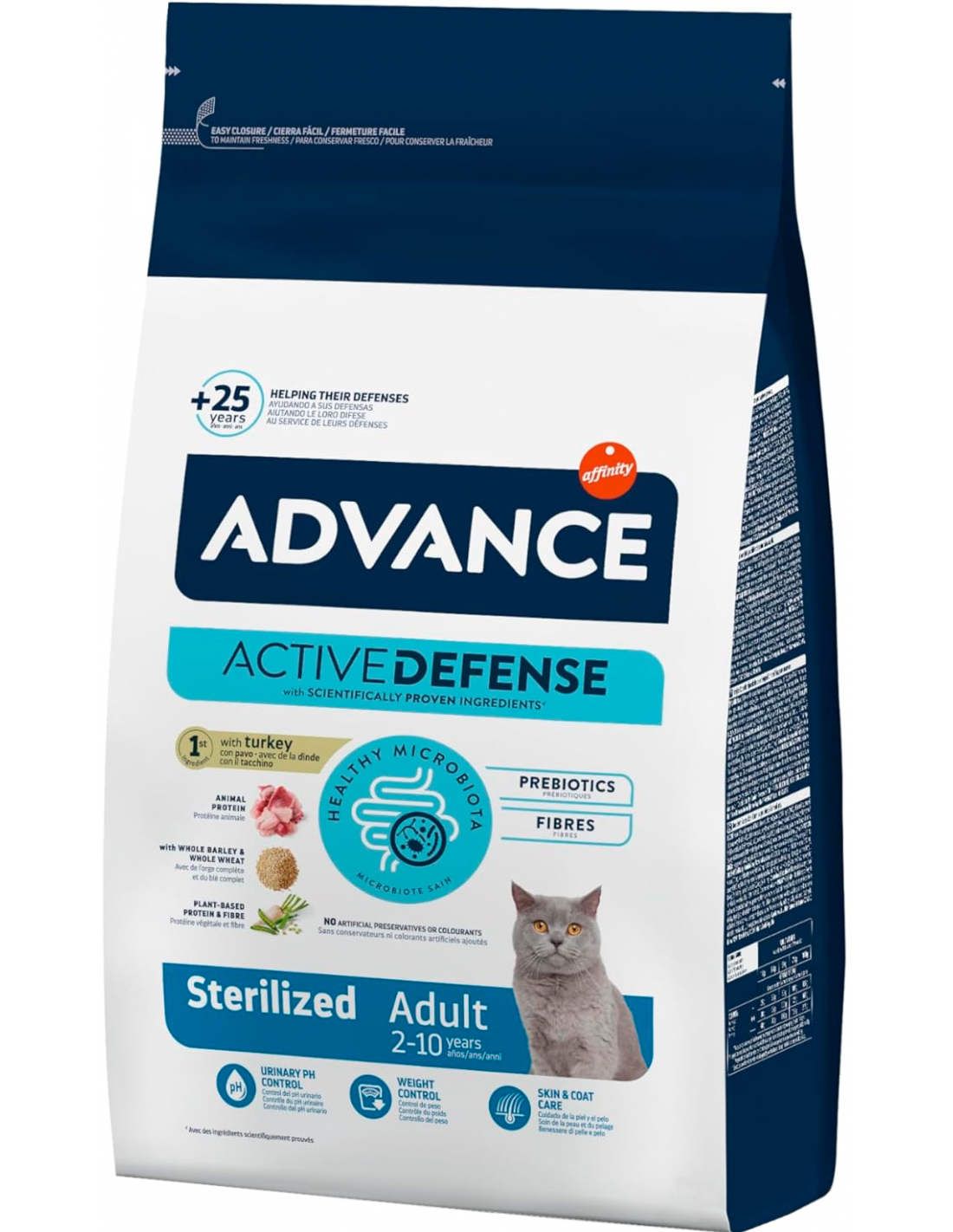 Advance Sterilized Adult amb gall dindi és un pinso complet i equilibrat per a gats esterilitzats i castrats d'1 a 10 anys. La seva fórmula, baixa en greixos i calories i rica en fibra de civada, ajuda al control de pes. Conté proteïnes de gall dindi d'alta qualitat per a la massa muscular i un contingut mineral adaptat per a un pH urinari ideal.
