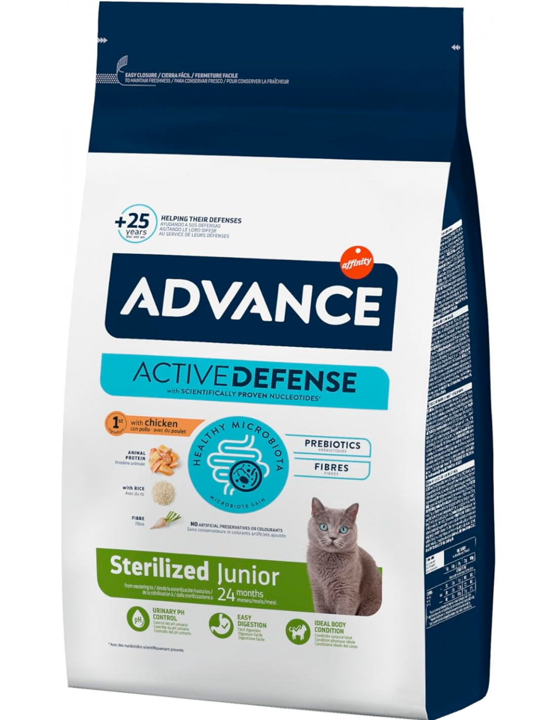 Affinity Advance Sterilized Junior amb pollastre és un pinso d'alta qualitat dissenyat per a gats esterilitzats joves de fins a 24 mesos. La seva recepta, amb pollastre i arròs, ofereix una proporció òptima de greix i proteïnes per a un creixement i desenvolupament muscular saludables, alhora que el seu contingut energètic adaptat ajuda a prevenir el sobrepès.