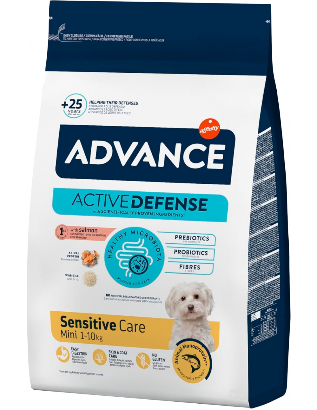 El pinso Advance Mini Sensitive és un aliment complet d'alta gamma dissenyat per a gossos de races petites (fins a 10 kg). La seva fórmula, amb un escàs contingut de greix i proteïnes, s'adapta al metabolisme d'aquests gossos. És ideal per a aquells amb intoleràncies alimentàries, gràcies al seu ingredient principal: el salmó, i la seva mida de croqueta adaptada facilita la masticació.