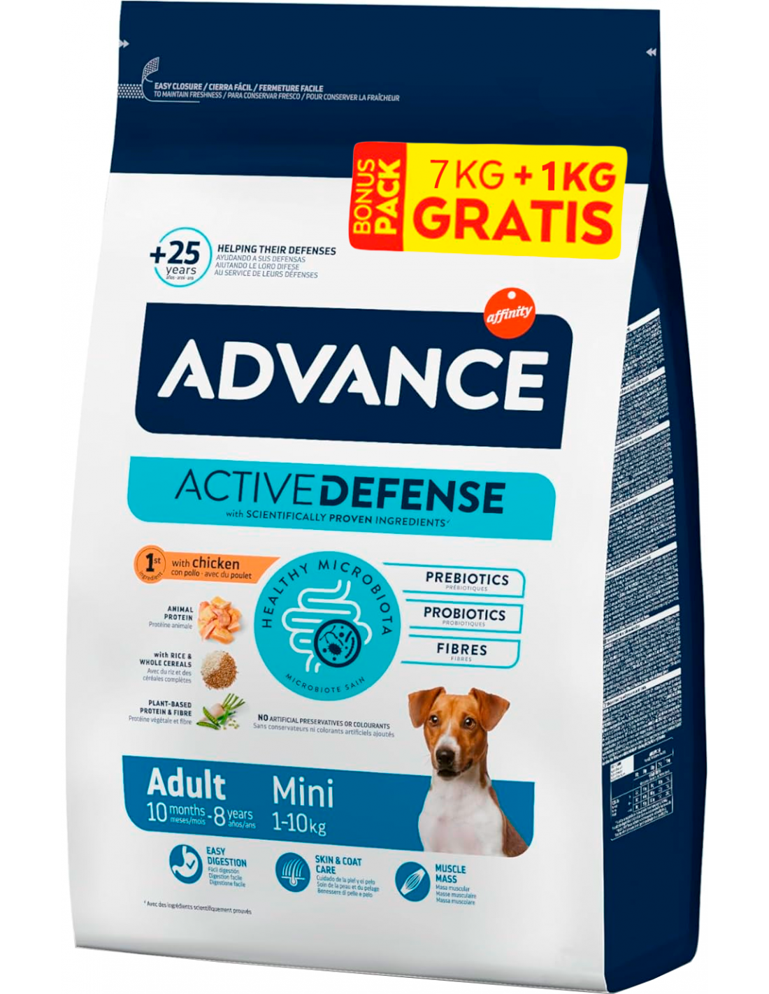Advance Mini Adult és un aliment complet i equilibrat especialment dissenyat per a les necessitats de les races de gos petites. Conté ingredients de fàcil digestió com pollastre i arròs, i aporta una quantitat òptima de proteïnes per mantenir la musculatura. Les seves croquetes de mida reduïda són ideals per a boques petites.