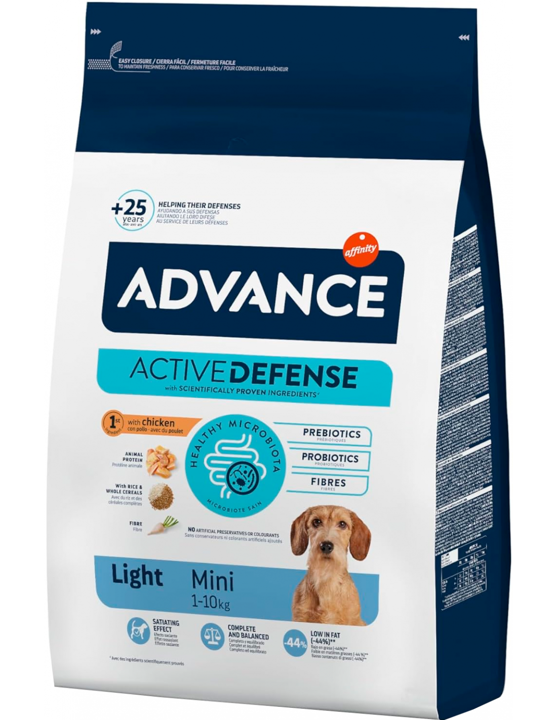 Advance Mini Light Pollastre i Arròs és un pinso desenvolupat per a gossos de races petites (fins a 10 kg) amb tendència al sobrepès o amb problemes d'obesitat. La seva fórmula amb pollastre i arròs, baix contingut en greix i alt en proteïnes, ajuda a controlar el pes mantenint la massa muscular magra.