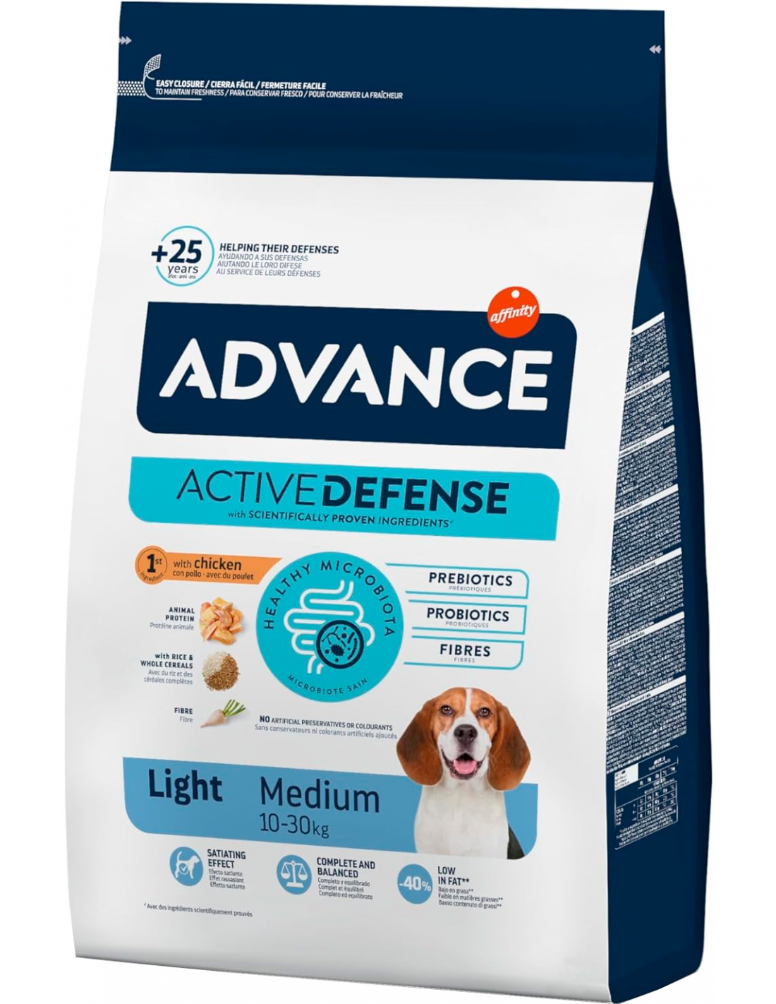 Advance Medium Light Pollo i Arròs és un pinso baix en greixos, dissenyat per a gossos adults de races mitjanes (10-30 kg) que necessiten controlar el seu pes. Amb un 48 % menys de greix que el pinso normal i abundant fibra, ajuda al teu gos a sentir-se saciat. El deliciós pollastre com a primer ingredient assegura proteïnes d'alta qualitat, i la seva fórmula Active Defense reforça les defenses.
