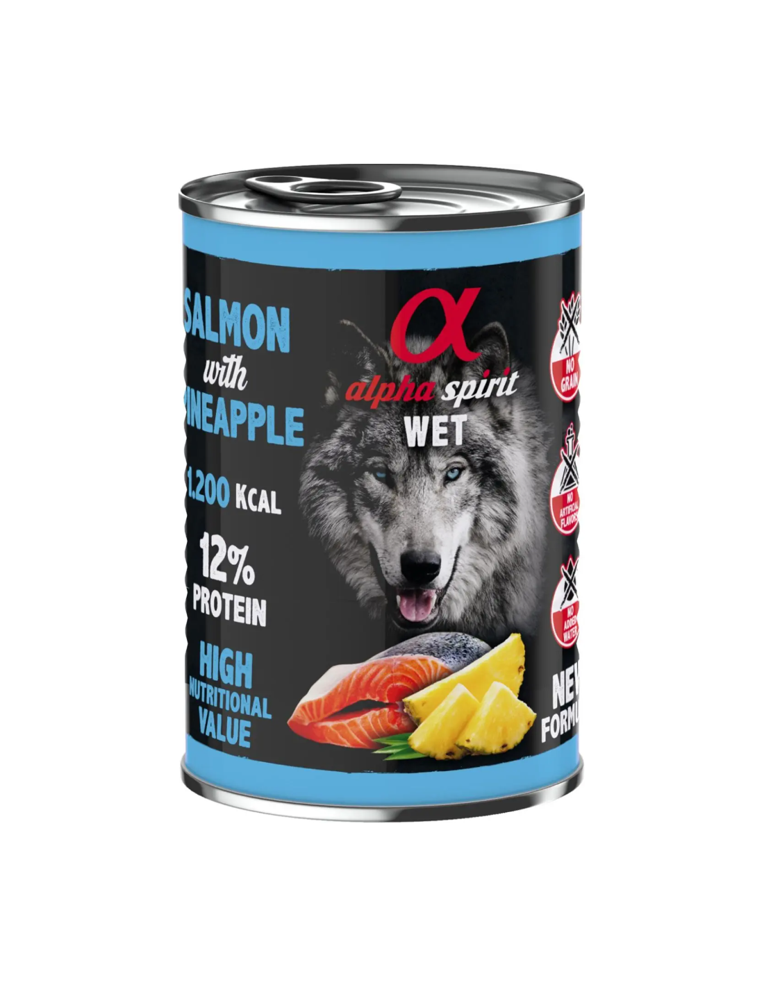El menjar humit complet per a gossos adults Alpha Spirit Adult Salmon with Pineapple està elaborat amb matèries primeres d’alta qualitat, un producte per a una alimentació equilibrada, saludable i plena de sabor.