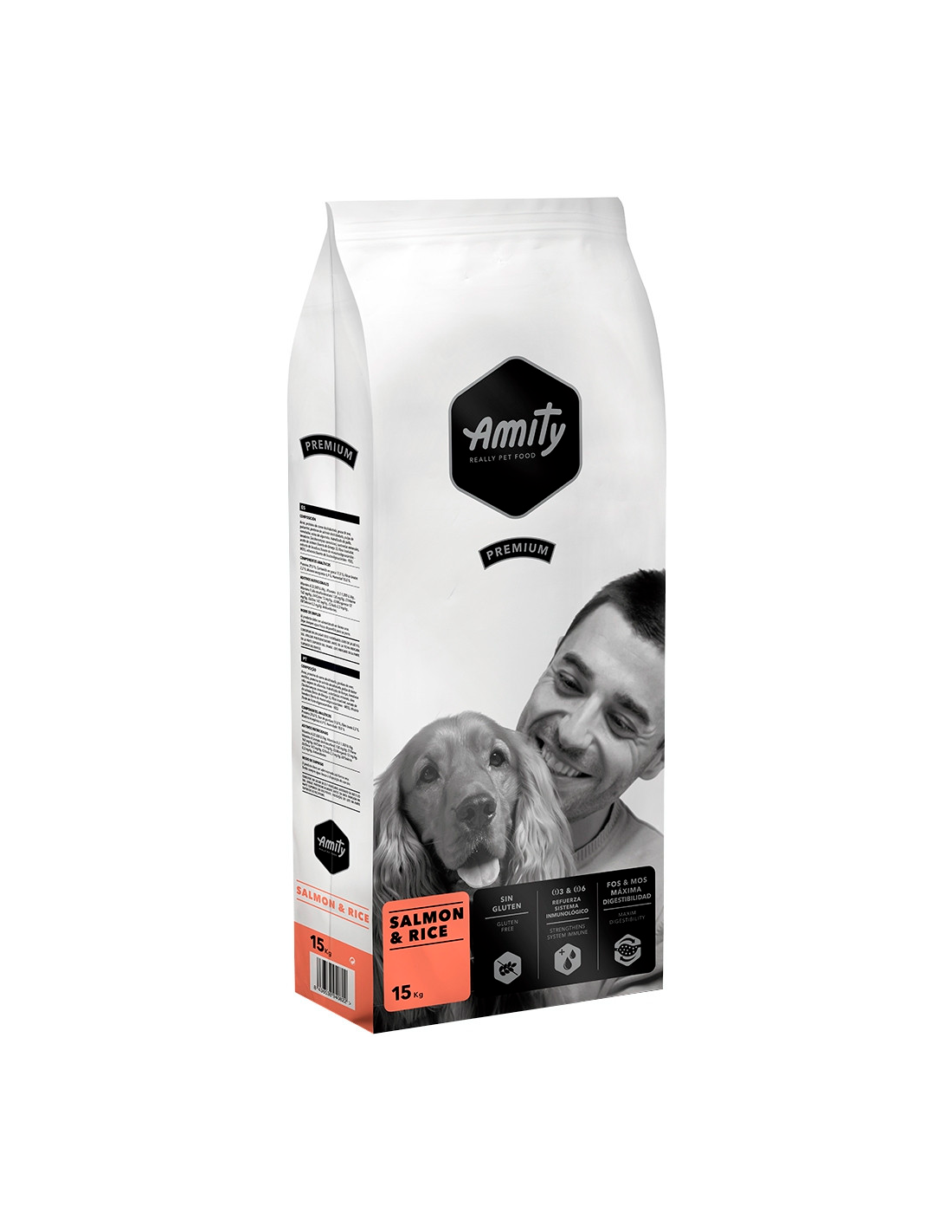 Amity Salmon & Rice és un pinso sec complet i equilibrat per a gossos adults, formulat amb proteïna de carn deshidratada (30%, de la qual un 4% és salmó) i arròs (4%). Amb alta digestibilitat gràcies a la seva composició equilibrada, aporta àcids grassos essencials, vitamines i minerals per cobrir totes les necessitats nutricionals del gos adult.