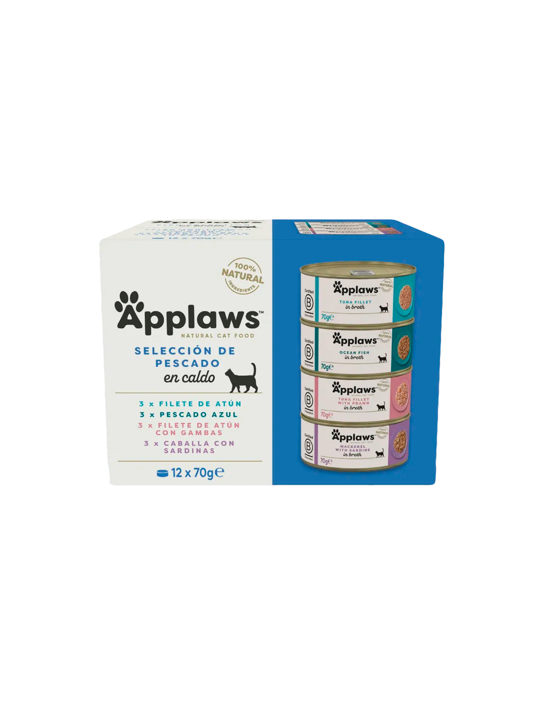 Applaws Adult Selecció de Peix en Brou és un multipack d'aliment humit complementari per a gats adults que ofereix 12 llaunes amb 4 receptes diferents on el peix és la principal font de proteïnes. Totes les receptes són 100% naturals, sense conservants, colorants ni additius, i inclouen taurina natural per al cor i la vista.
