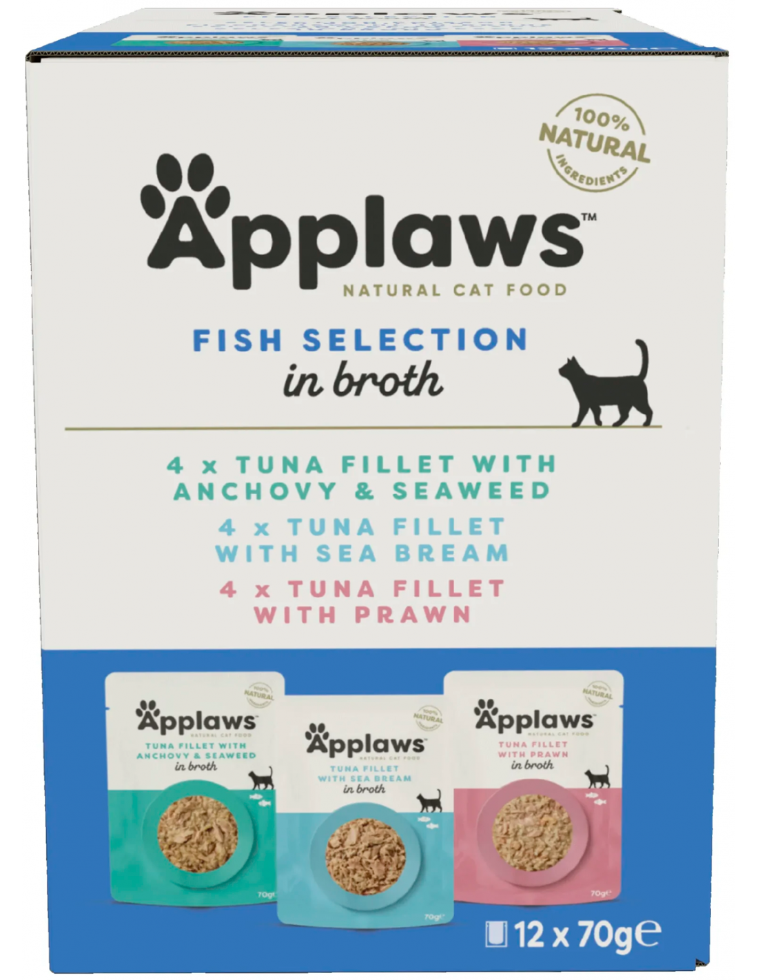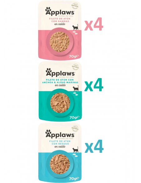 Applaws Adult Selecció de Peix en Brou és un multipack d'alimentació humida per a gats adults amb una varietat de receptes de peix. Elaborat amb ingredients naturals, aporta una font natural de taurina essencial per al correcte funcionament del cor i la salut ocular del teu gat.