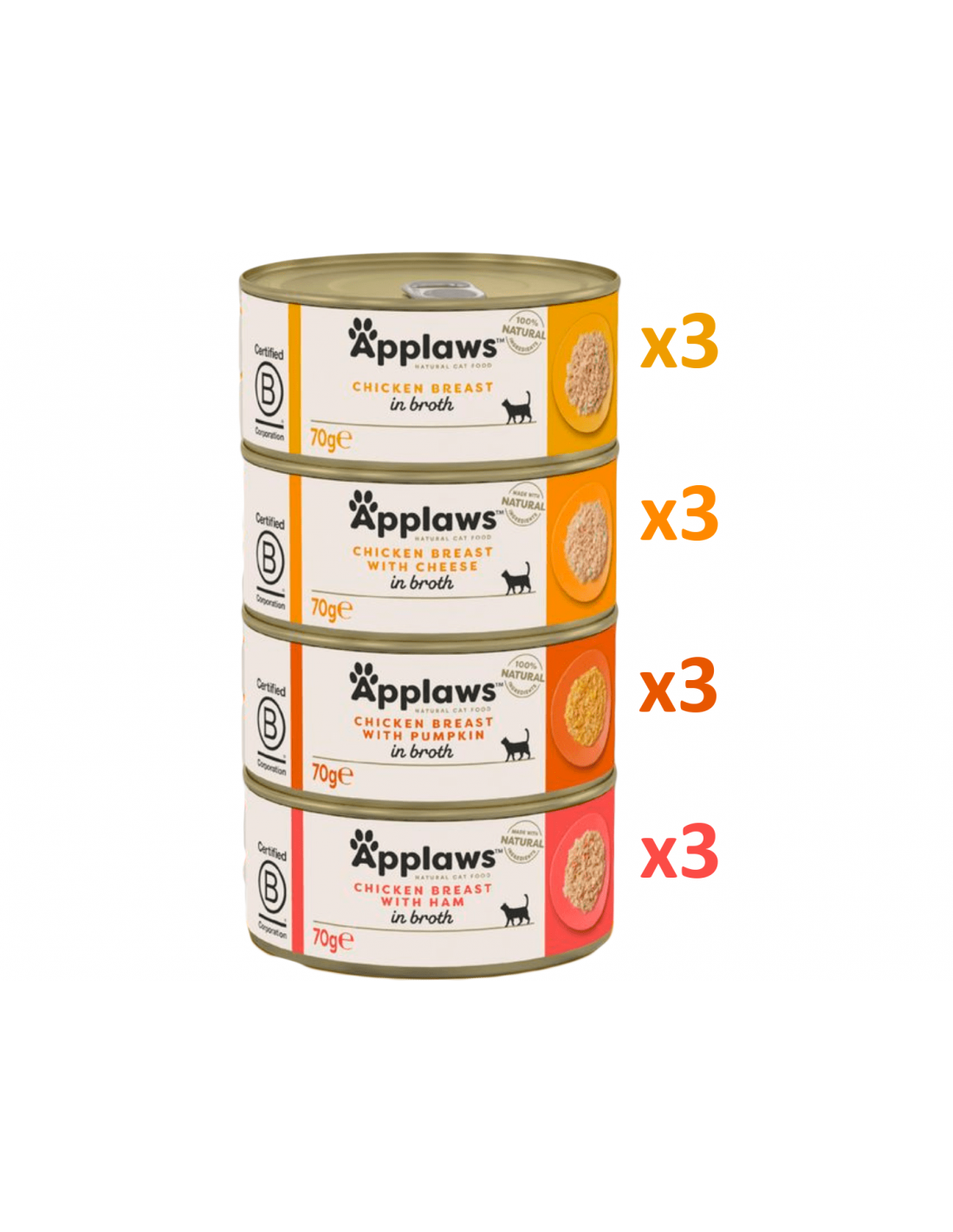 Applaws Adult Selecció de Pollastre en Brou és un multipack d'aliment humit complementari per a gats adults que ofereix 12 llaunes amb 4 receptes diferents on el pollastre és la principal font de proteïnes. Totes les receptes són 100% naturals, sense conservants, colorants ni additius, i inclouen taurina natural per al cor i la vista.