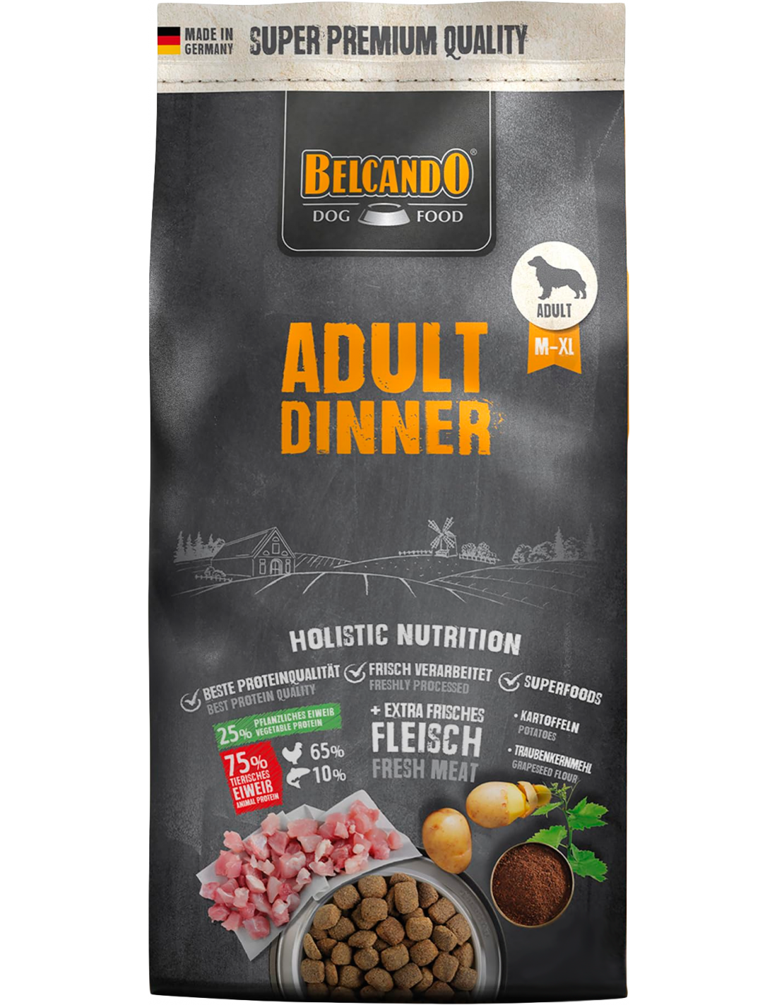 L'acurada selecció de les matèries primeres (carn d'au molt tendre, saludables patates i farina d'ossos de raïm premsat en fred) fa que la combinació de nutrients de BELCANDO Adult Dinner sigui ideal per gossos adults. El baix contingut en proteïnes i greixos s'ajusta a les necessitats dels gossos amb una activitat normal.