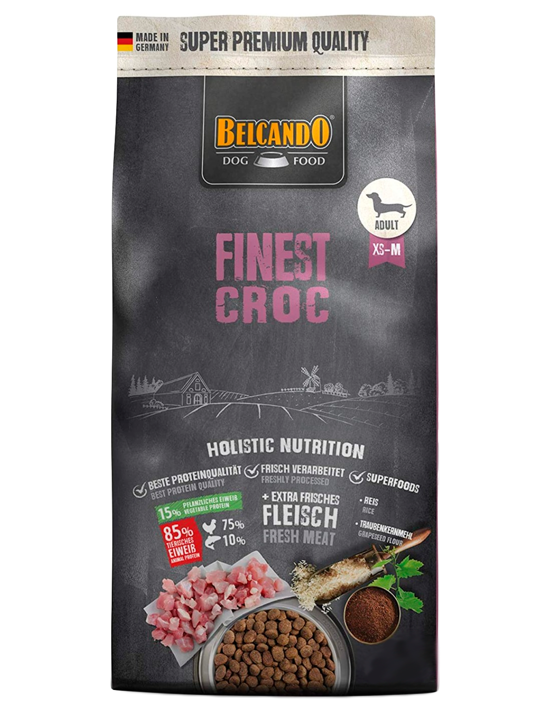 BELCANDO Finest Croc és l'elecció ideal per a gossos adults amb nivells d'activitat normal i paladars exquisits. Gràcies a les seves matèries primeres especialment seleccionades, com el saborós ànec i el fetge, juntament amb l'arròs de molt fàcil digestió i la valuosa farina de llavor de raïm premsada en fred, cada àpat és un plaer molt saludable en tots els sentits. El seu alt contingut en proteïnes i greixos afavoreix la digestió i redueix el volum fecal.