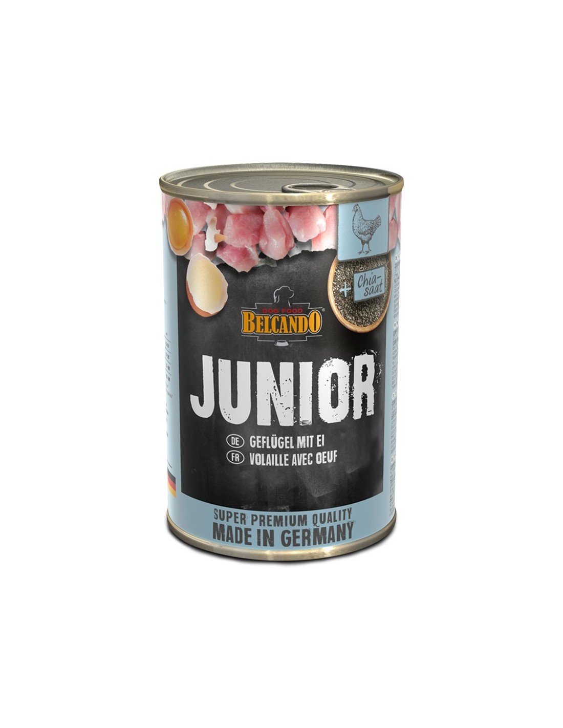 Belcando Junior amb au i ou 400 gr. Menjar Humit Super Premium d'Au (93,5%) amb Ou sencer (4%) i Llavors de xia (1%)