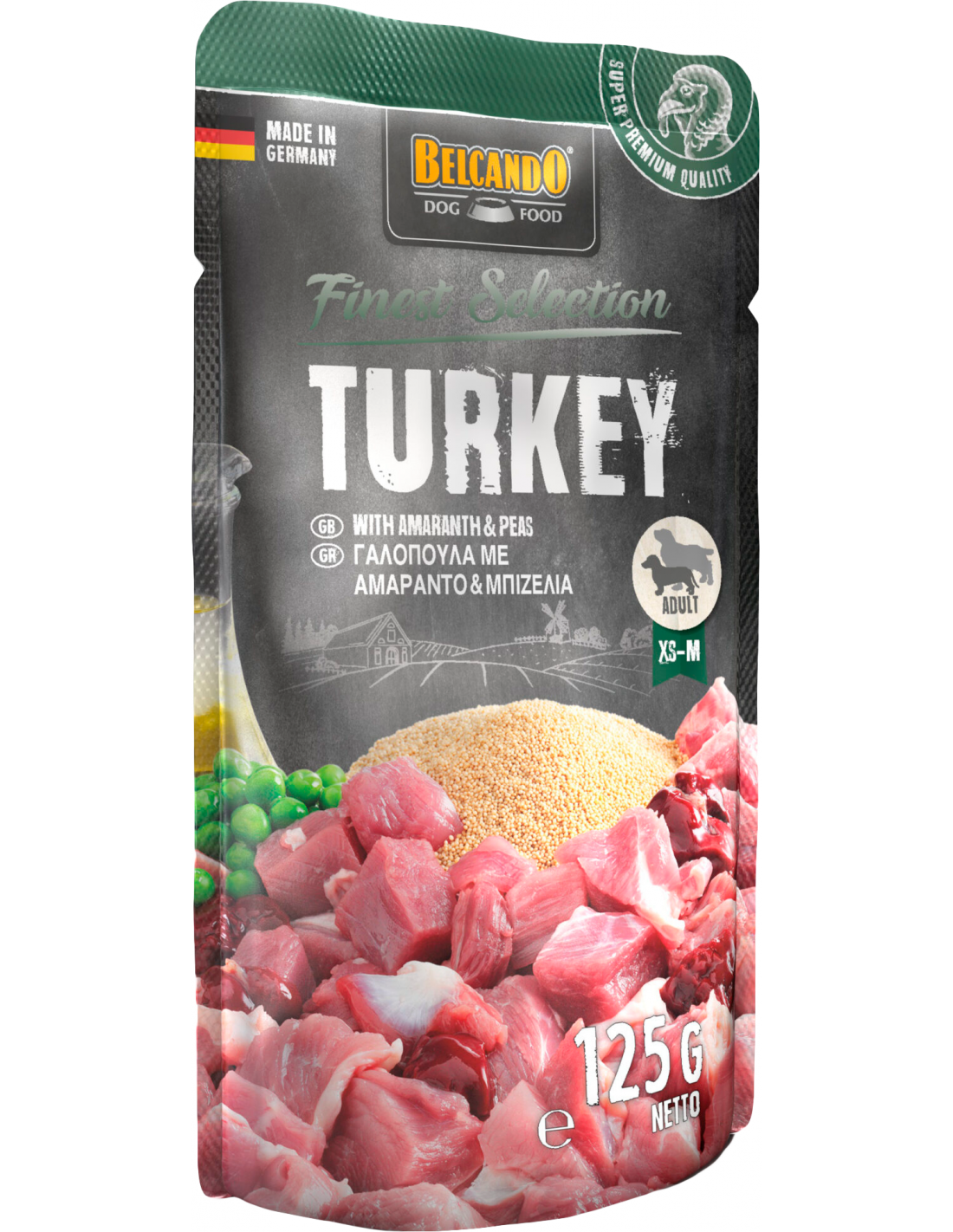 Menjar humit Premium compost de gall dindi (89,5%), amarant (5%) i pèsols (4%). Sobre de 125 gr.