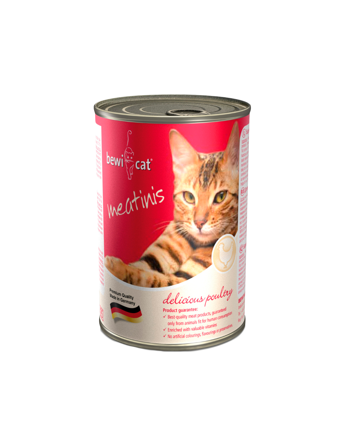 Bewi Cat Meatinis Adult Ric en Aus és un aliment humit amb una sucosa textura de carn, ideal per a gats que prefereixen una dieta mixta. Conté un 68% de productes càrnics, d'animals aptes per al consum humà i no inclou cereals, soja ni additius artificials.