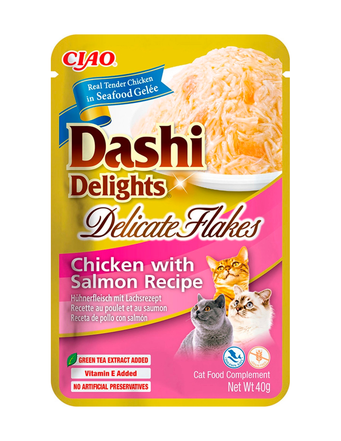 Ciao Cat Dashi Delights Delicate Flakes Pollastre amb Salmó és un aliment humit complementari ideal per a la salut i benestar del teu felí. Amb un 93% d'hidratació i alt contingut en proteïna, afavoreix la ingesta de líquids i manté la salut renal. La seva textura suau amb delicats trossos de pollastre amb salmó en gelatina, juntament amb el brou Dashi japonès, ofereix un sabor deliciós que els gats adoren. La seva recepta és baixa en calories i greix, sense conservants artificials.
