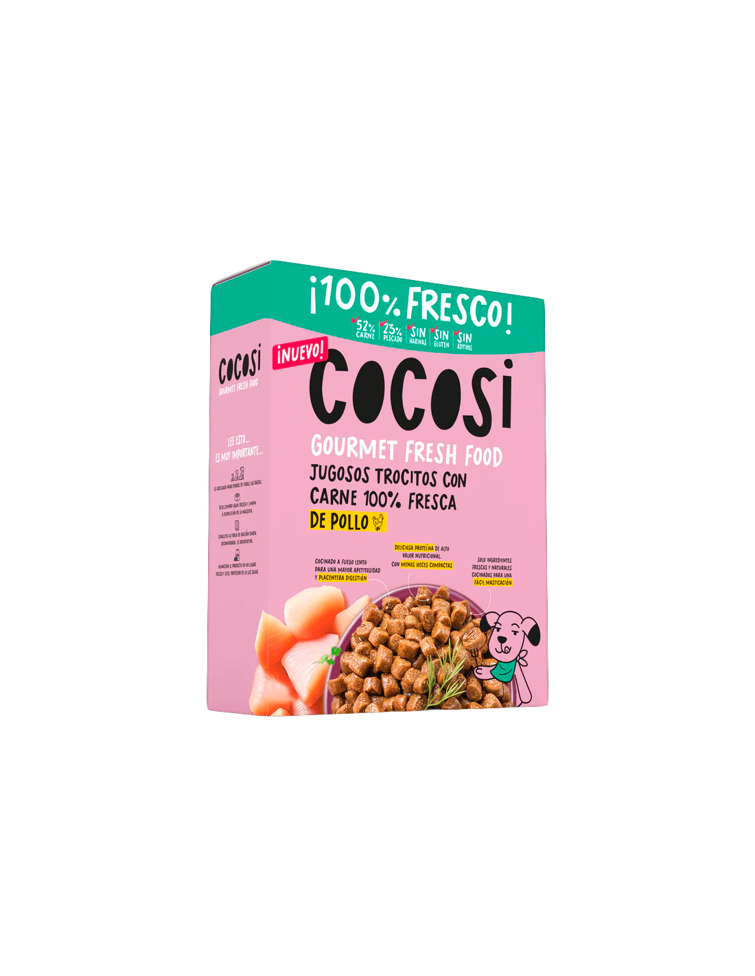 Menjar fresc natural premsat en fred per a gossos adults, amb 52% pollastre fresc i 23% peix fresc, sense gluten ni OMG.