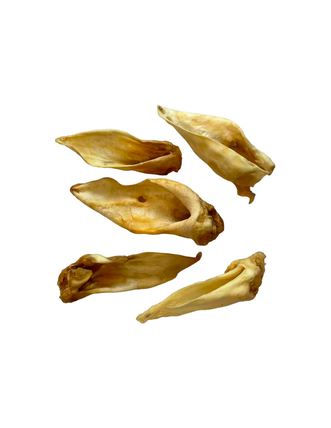 Snack 100% natural d'orella de xai dessecada per a gossos. Ideal per a la salut dental, alta digestibilitat i ric en proteïnes. 5 unitats.