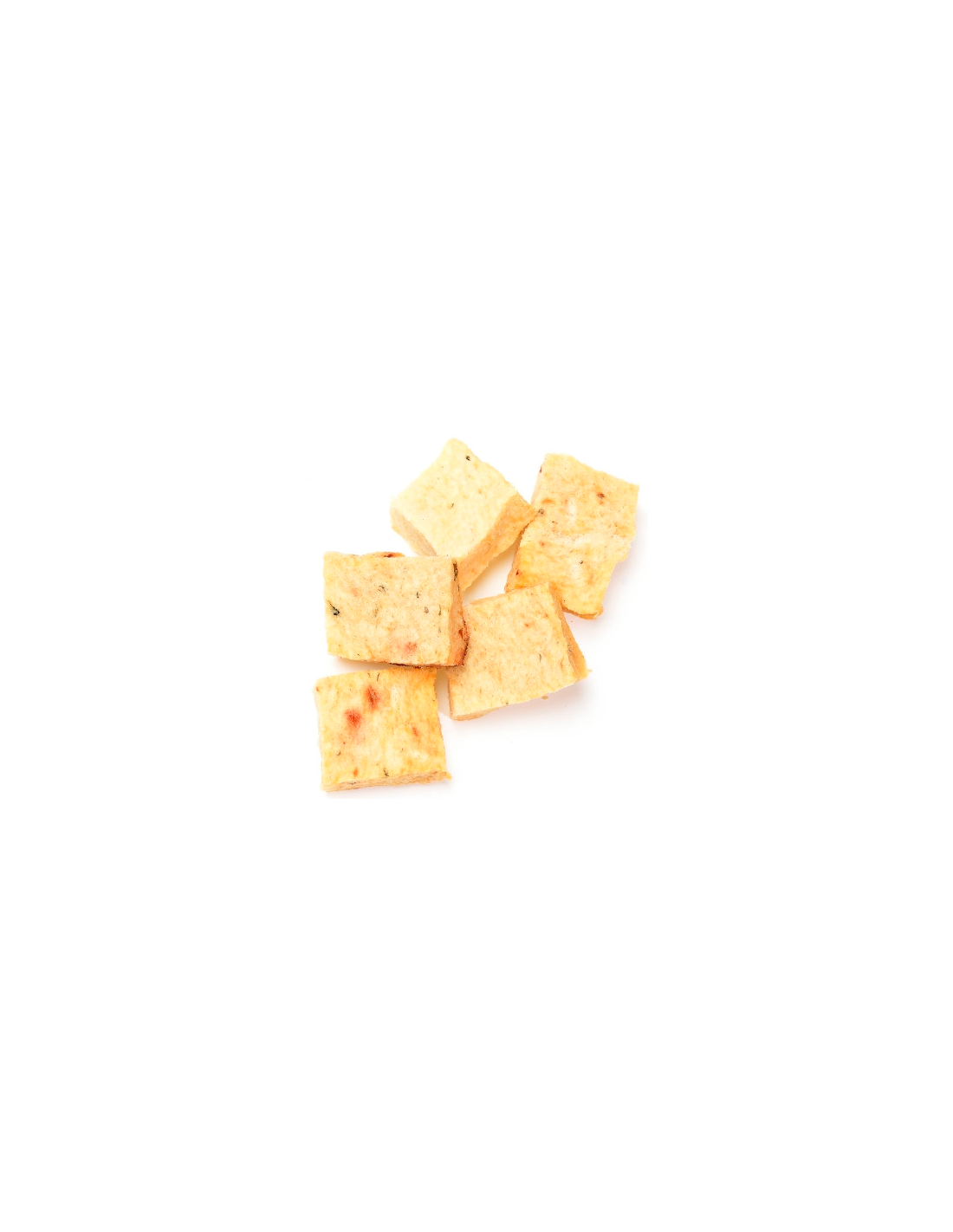 Snack deshidratat 100% de bacallà, baix en greix i hipoalergènic. Bossa de 100 gr.