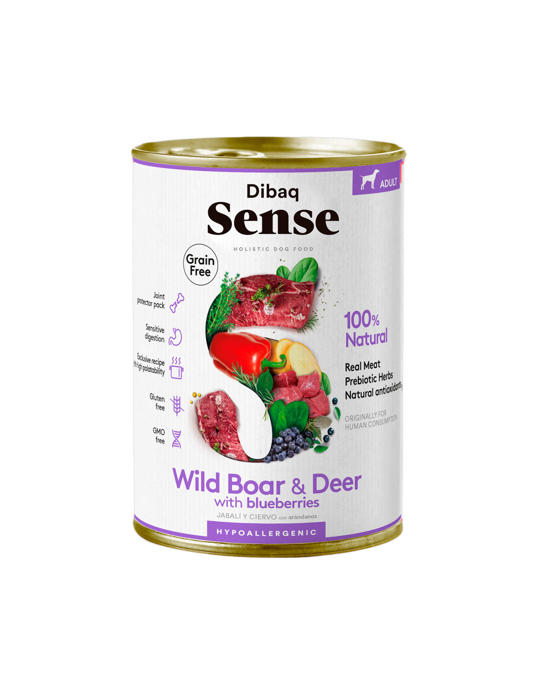 Dibaq Sense Adult Grain Free Senglar i Cérvol Paté és un aliment humit 100% natural i hipoal·lergènic per a gossos adults de totes les races. Formulat sense cereals ni gluten, està elaborat amb carns fresques de cérvol i senglar, juntament amb fruites i verdures fresques, protectors articulars i antioxidants naturals.