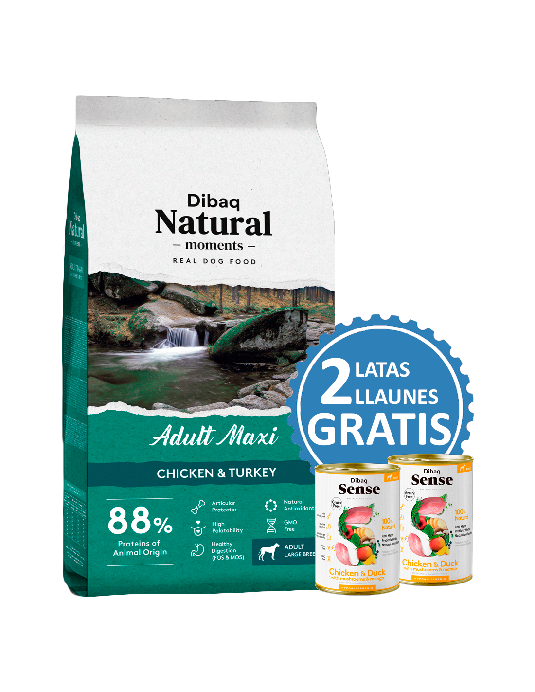 Dibaq Natural Moments Adult Maxi Pollastre i Gall Dindi és un pinso complet per a gossos adults de races grans, elaborat amb pollastre i gall dindi. Destaca pel seu alt contingut de proteïna d'origen animal (fins a un 88%), i està enriquit amb protectors articulars, prebiòtics, antioxidants i plantes naturals, oferint una digestibilitat òptima.
