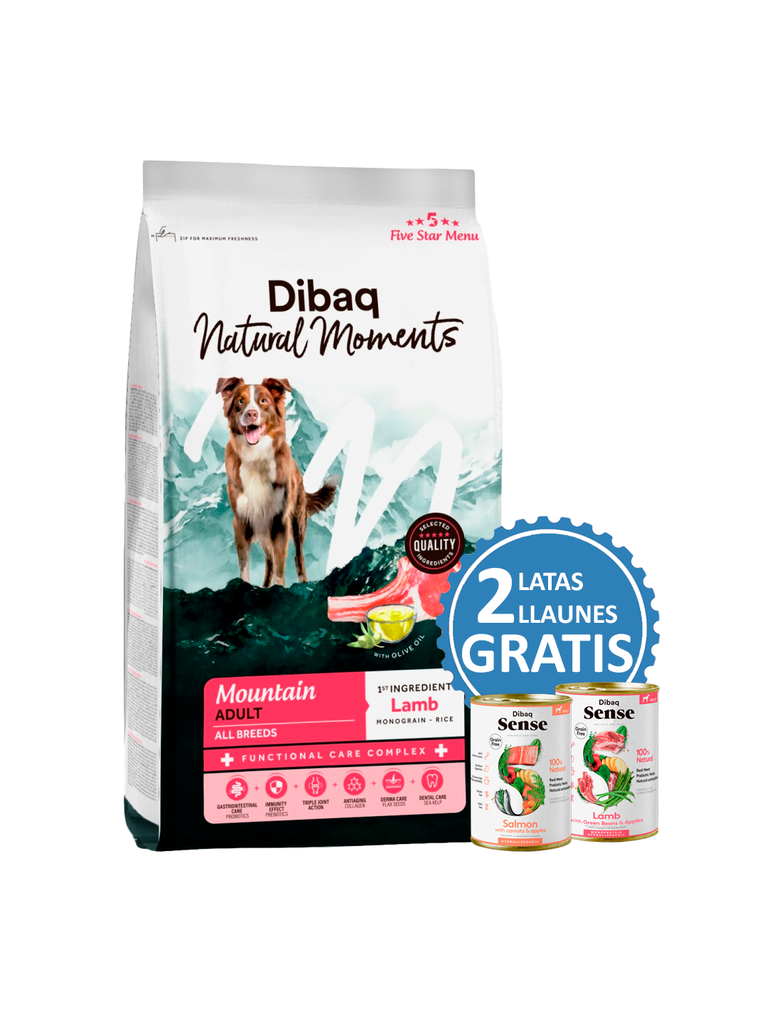 Dibaq Natural Moments Adult Mountain Xai és un pinso hipoal·lergènic i monogra de arròs, formulat per a gossos adults de totes les races. Destaca pel seu alt contingut en xai (20%) i gall dindi (18%), oferint una nutrició funcional, saborosa i fàcilment digestible, sense blat, gluten, blat de moro, soja ni colorants artificials.