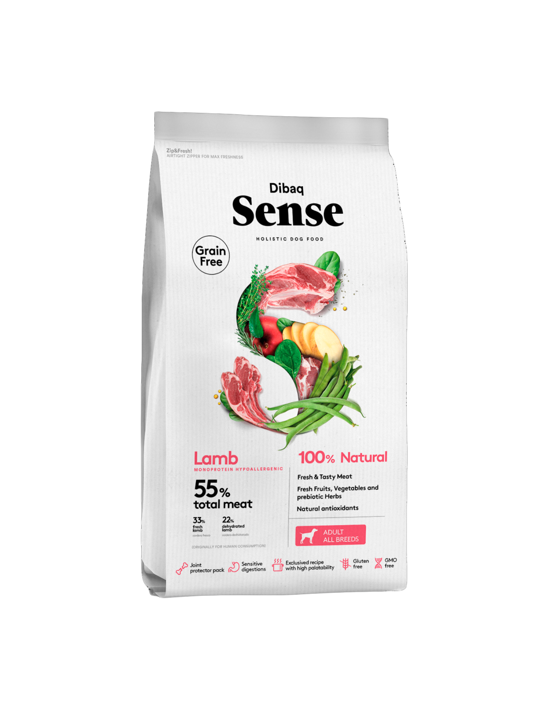 Dibaq Sense Grain Free Xai és un pinso monoproteic i 100% natural per a gossos adults de totes les races. Lliure de cereals, està cuinat amb carn fresca de xai, fruites i verdures fresques, sent ideal per a gossos amb digestions sensibles o intoleràncies alimentàries.