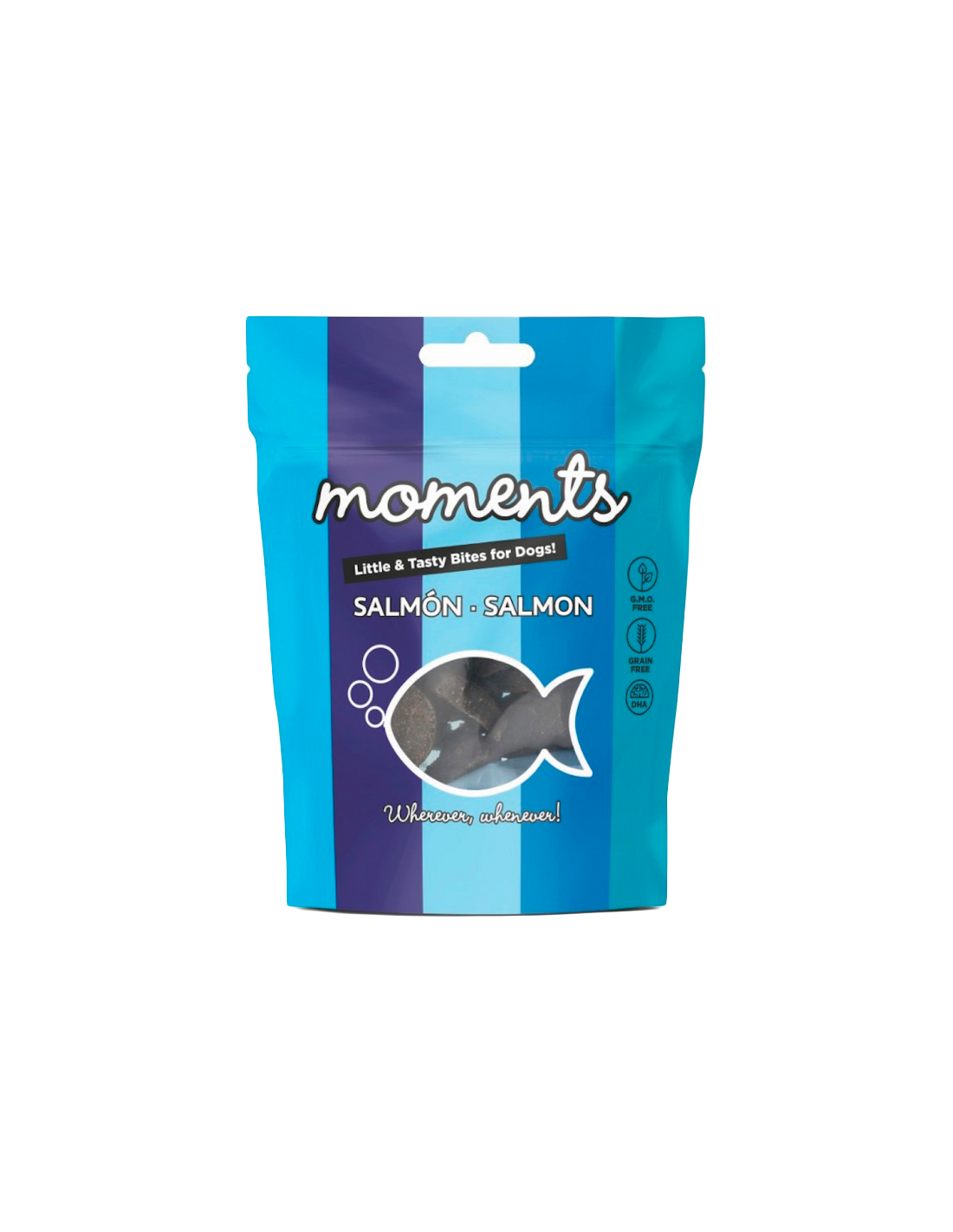 Dingo Moments Adult Salmó són fantàstics snacks amb formes i sabors divertits. Estan elaborats amb un 70% de salmó fresc, són rics en DHA i totalment lliures de gra i de transgènics, fent-los ideals per a gossos adults amb sensibilitats.