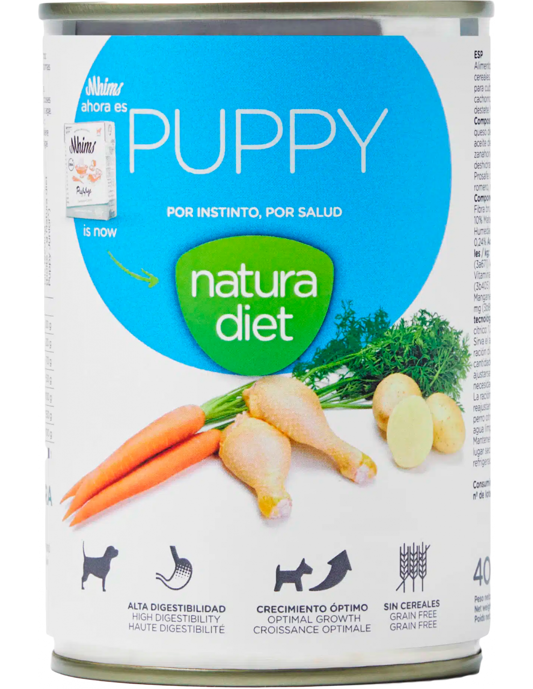 Dingo Natura Diet Puppy és un aliment humit complet i natural, sense cereals, en forma de paté, elaborat amb pollastre fresc per cobrir les necessitats dels cadells des del deslletament fins a l'edat adulta, promovent un creixement òptim i una alta digestibilitat.