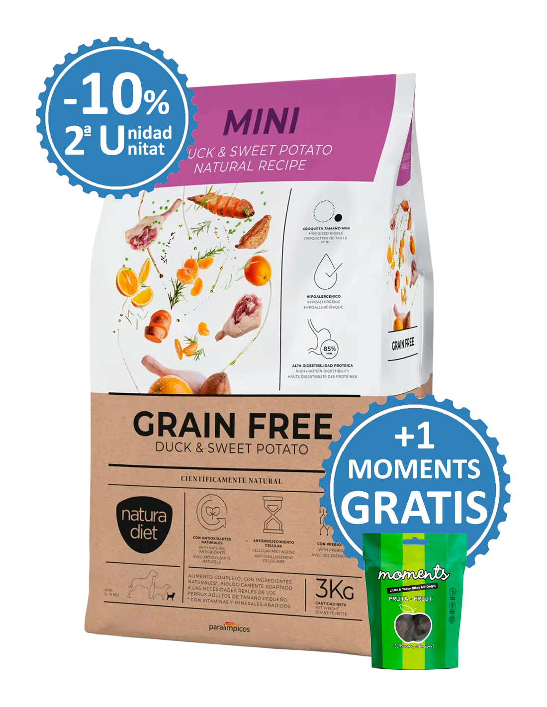 Dingo Natura Diet Adult Mini Grain Free Ànec i Moniato és un aliment complet i equilibrat, amb ingredients naturals, biològicament adaptat a les necessitats de gossos adults de mida petita. Formulat sense cereals, és ideal per a gossos amb sensibilitats o al·lèrgies alimentàries.
