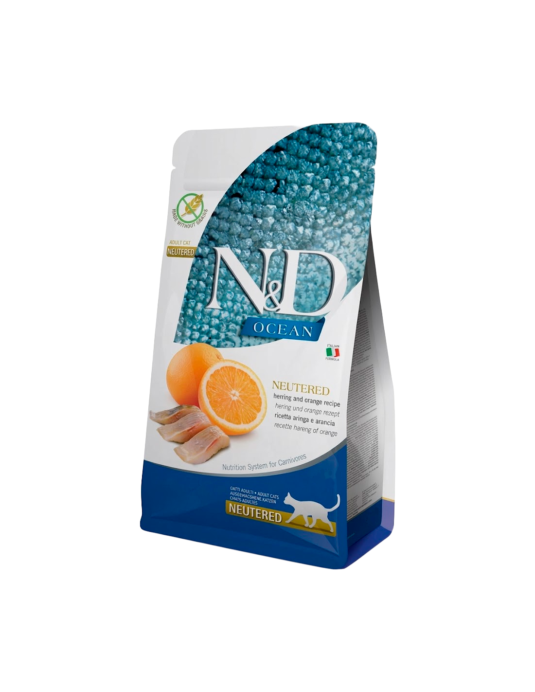 Farmina N&D Ocean Neutered Adult Areng i Taronja és un aliment complet dissenyat per a gats adults castrats. Ric en proteïnes de productes del mar i àcids grassos omega-3, aquesta fórmula sense cereals afavoreix la vitalitat, el desenvolupament muscular i el benestar general, adaptant-se a les necessitats específiques dels gats castrats.