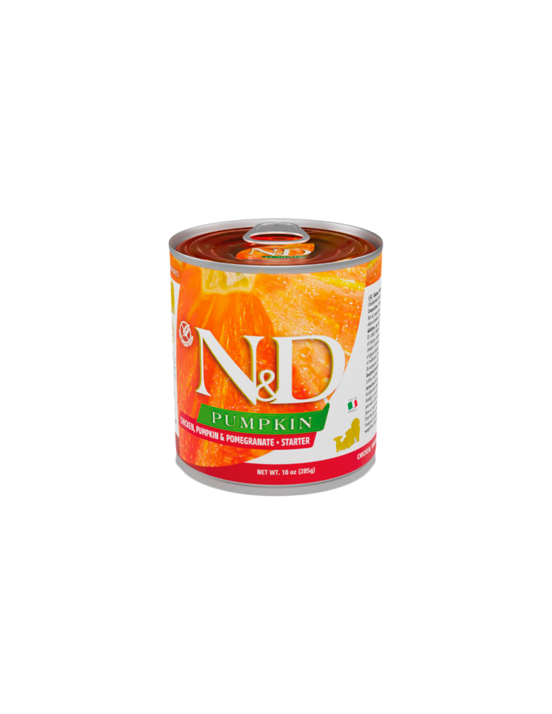 Farmina Pollastre, Carbassa & Magrana Starter Puppy Llauna és una dieta d'alt rendiment científicament formulada per a cadells, garantint una nutrició òptima. Aquest aliment humit, sense cereals ni conservants artificials, està enriquit amb carbassa i proporciona un 96% de proteïnes de fonts animals d'alta qualitat.