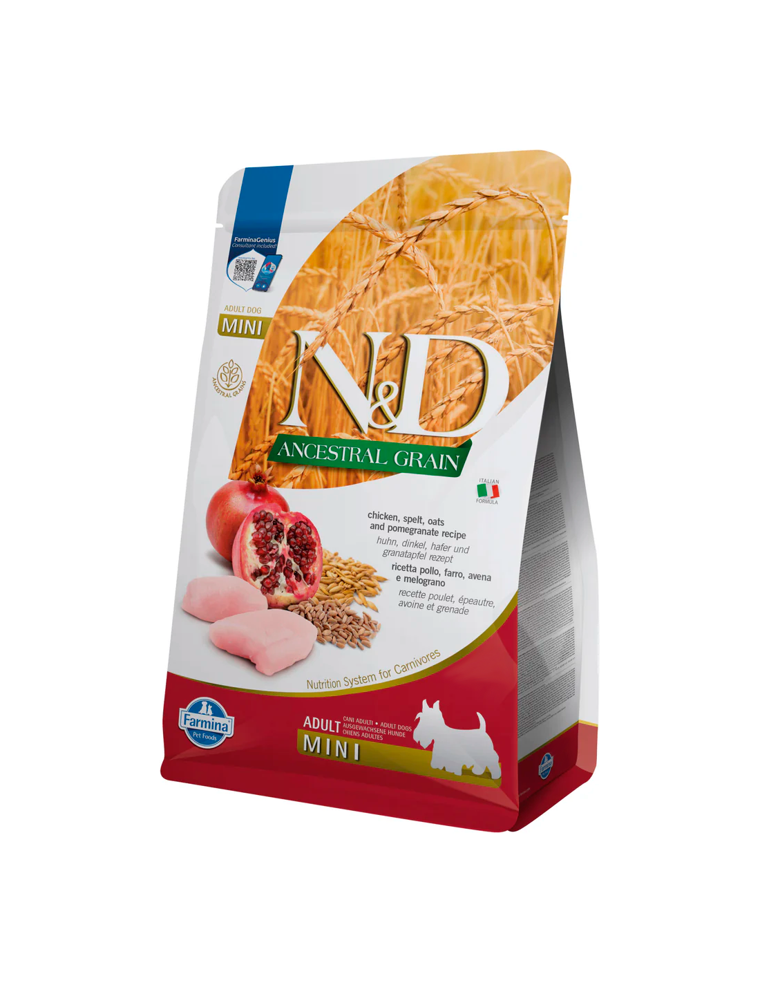 Farmina N&D Ancestral Grain Canine Pollastre & Magrana Adult Mini és un aliment complet per a gossos adults de races de mida petita i mini. Elaborat a base de pollastre, espelta, civada i magrana, aquesta línia premium ofereix més del 90% de proteïnes d'origen animal, un baix índex glucèmic i una nutrició holística.