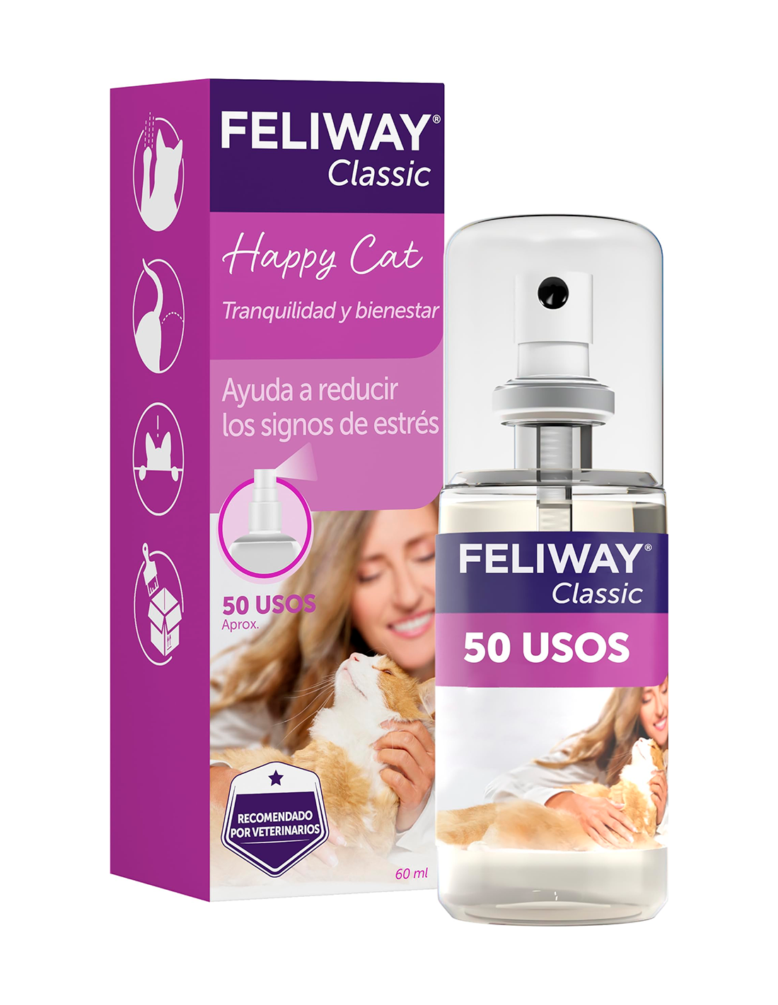 Spray: allibera feromones per calmar gats en viatges (transportí) i reduir marcatge d'orina/esgarrapades a casa.