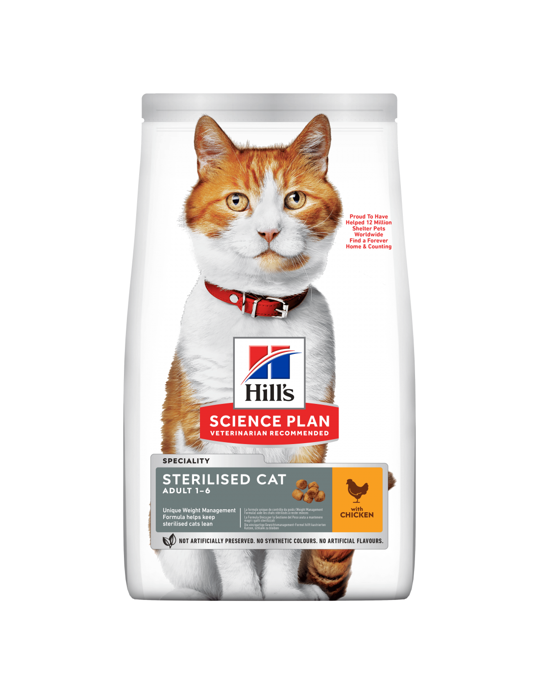 Hill's Science Pla Sterilised Cat aliment per a gats adults amb pollastre és un aliment complet per a gats esterilitzats d'1 a 6 anys d'edat.