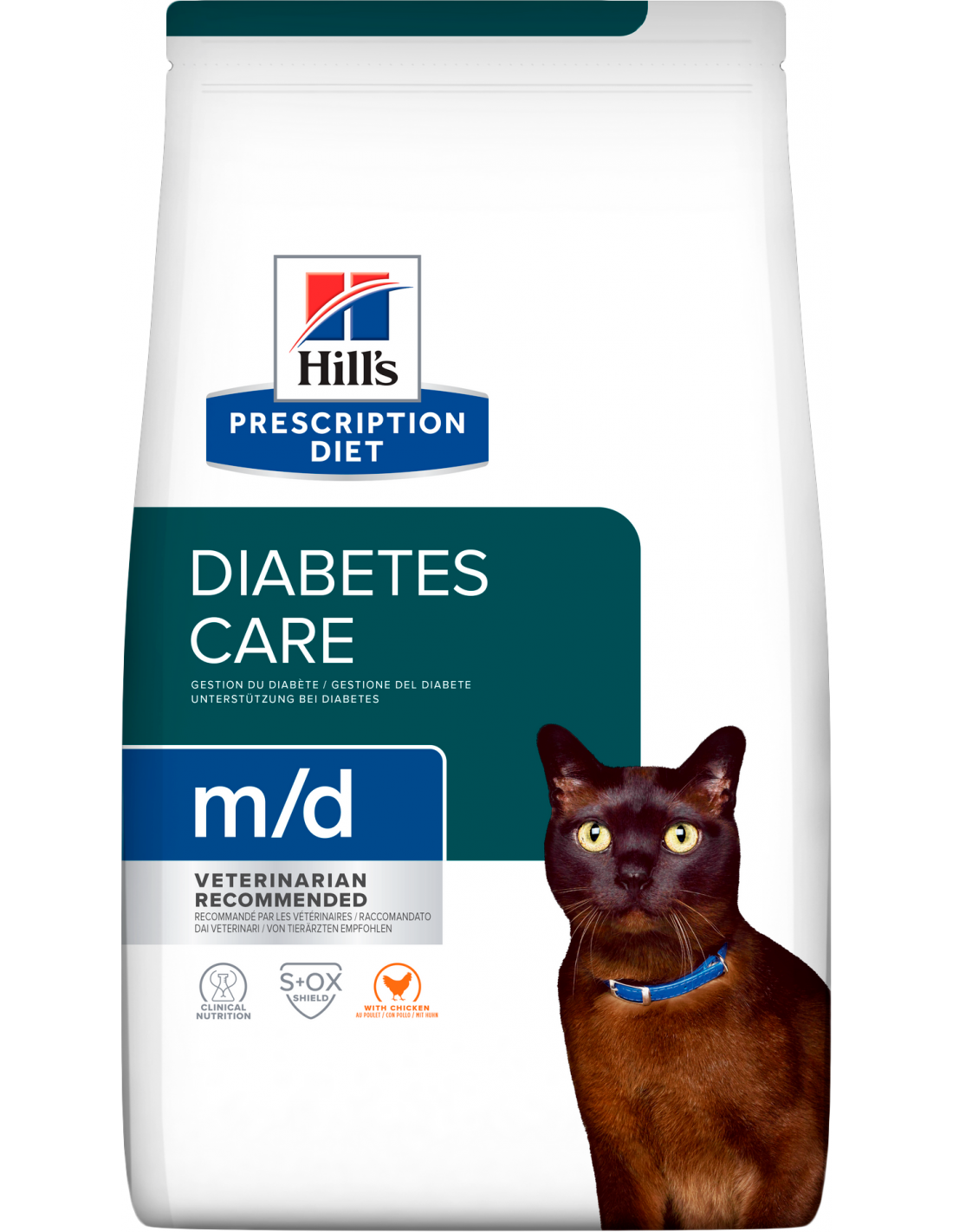 Hill's Prescription Diet Cat m/d Diabetes Care és una nutrició clínica en format pinso, formulada per ajudar els gats a perdre pes i a regular el nivell de sucre en sang. Desenvolupat per nutricionistes i veterinaris de Hill's per a les necessitats úniques de gats diabètics o amb sobrepès.
