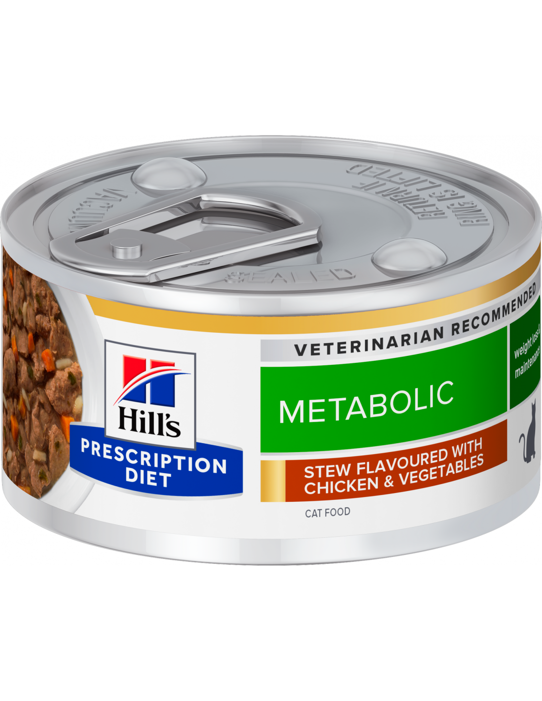Hill's Prescription Diet Cat Metabolic és una nutrició clínicament provada, formulada per ajudar els gats a perdre pes de forma natural i mantenir-lo. Actua sobre la despesa energètica del gat per a una pèrdua de pes fàcil i efectiva, estimulant la seva capacitat natural per cremar greix i proporcionant energia per al joc. La seva combinació exclusiva de fibres ajuda a que els gats se sentin saciats. És un aliment complet per a la pèrdua i el manteniment del pes.