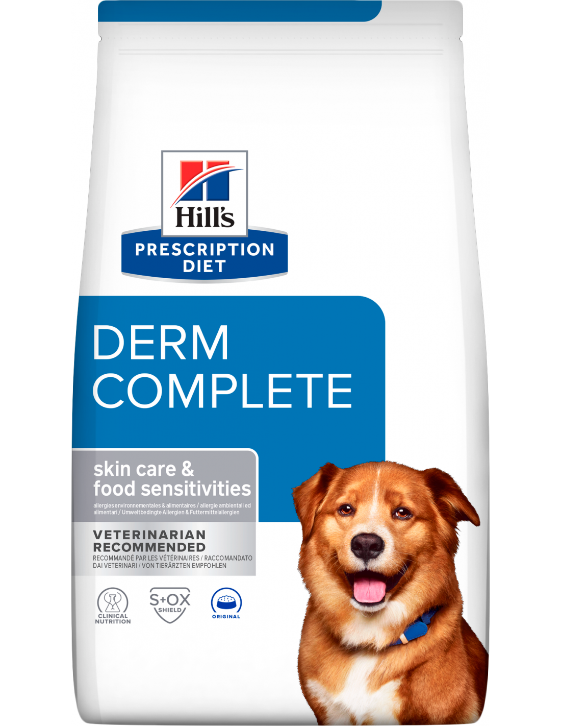 Hill's Prescription Diet Derm Complete és una nutrició clínica formulada específicament per ajudar a controlar les al·lèrgies ambientals i alimentàries en gossos. Proporciona una nutrició completa i equilibrada que es pot utilitzar a llarg termini per enfortir la barrera cutània i evitar reaccions adverses.