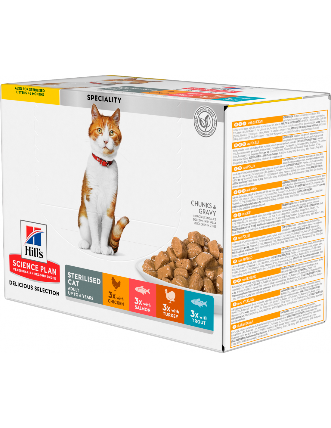Hill's Science Plan Cat Adult Sterilised Gravy Pack Mix és una nutrició acuradament equilibrada, dissenyada per a gats esterilitzats. Inclou antioxidants clínicament provats i una fórmula única que ajuda a controlar el pes i mantenir els gats en forma. Amb aquest multipack de trossets en salsa, el teu gat gaudirà d'un equilibri perfecte entre sabor i una nutrició d'alta qualitat i fàcil digestió.