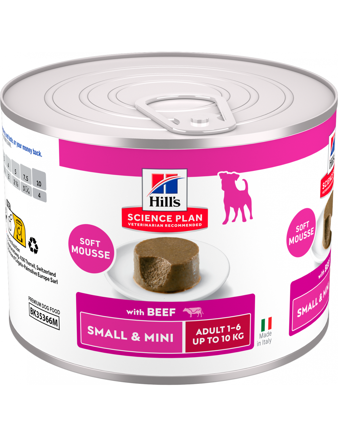 Hill's Science Plan Canine Adult Mousse Small & Mini amb vedella és un aliment humit complet d'alta qualitat, acuradament equilibrat per a gossos adults de races petites i mini d'1 a 6 anys. Aquesta deliciosa mousse aporta l'energia i nutrició adaptada a les seves necessitats úniques per a una vida sana i feliç.
