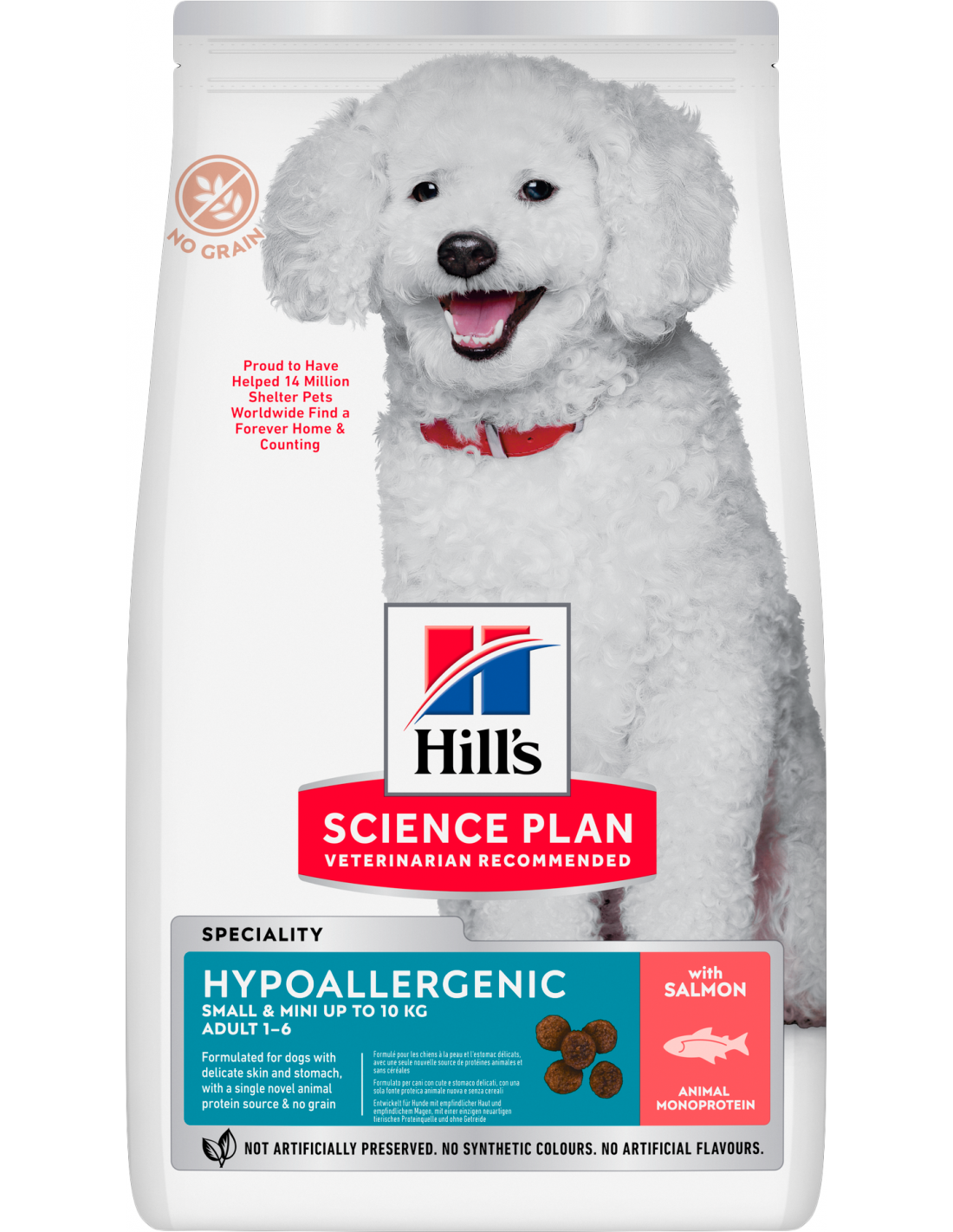 Hill's Science Plan Hypoallergenic aliment per a gossos adults de races petites i mini amb salmó és un aliment complet formulat per a gossos adults de races petites d'1 a 6 anys d'edat. És ideal per a aquells amb pell i estómac delicats, gràcies a les seves fonts limitades de proteïna innovadora d'alta qualitat i la seva recepta sense cereals.