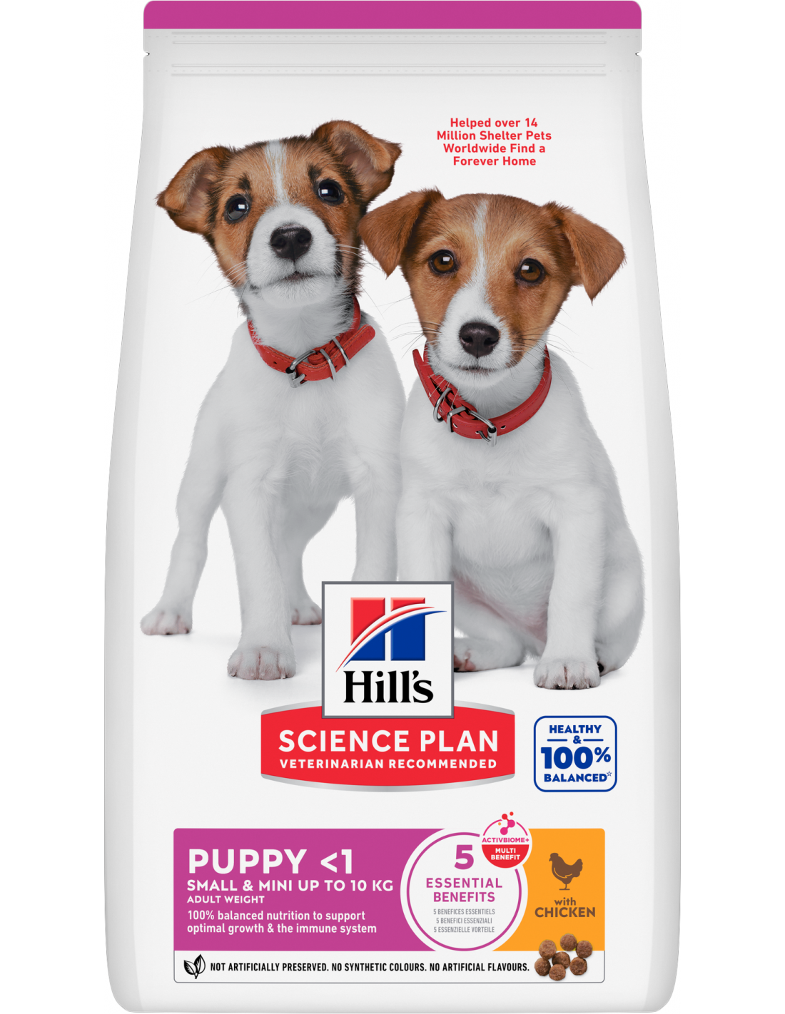 L'aliment Hill's Science Plan Dog Puppy Small & Mini amb pollastre és un pinso complet i 100% equilibrat, especialment formulat amb la tecnologia ActivBiome+ Multi-Benefit. Ofereix una nutrició òptima per afavorir el creixement i un sistema immunitari fort en cadells de races petites i mini.