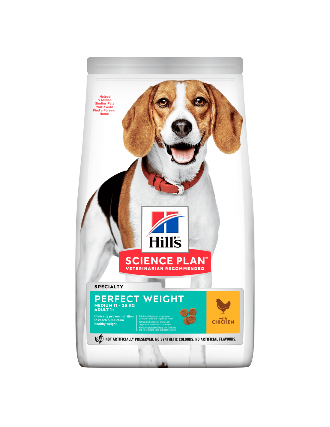 Hill's Science Pla PERFECT WEIGHT MEDIUM ALIMENT PER A GOSSOS ADULTS amb POLLASTRE (pollastre 7%) és un aliment complet per a gossos adults mitjans des d'1 any d'edat amb tendència a guanyar pes o amb un lleuger sobrepès.