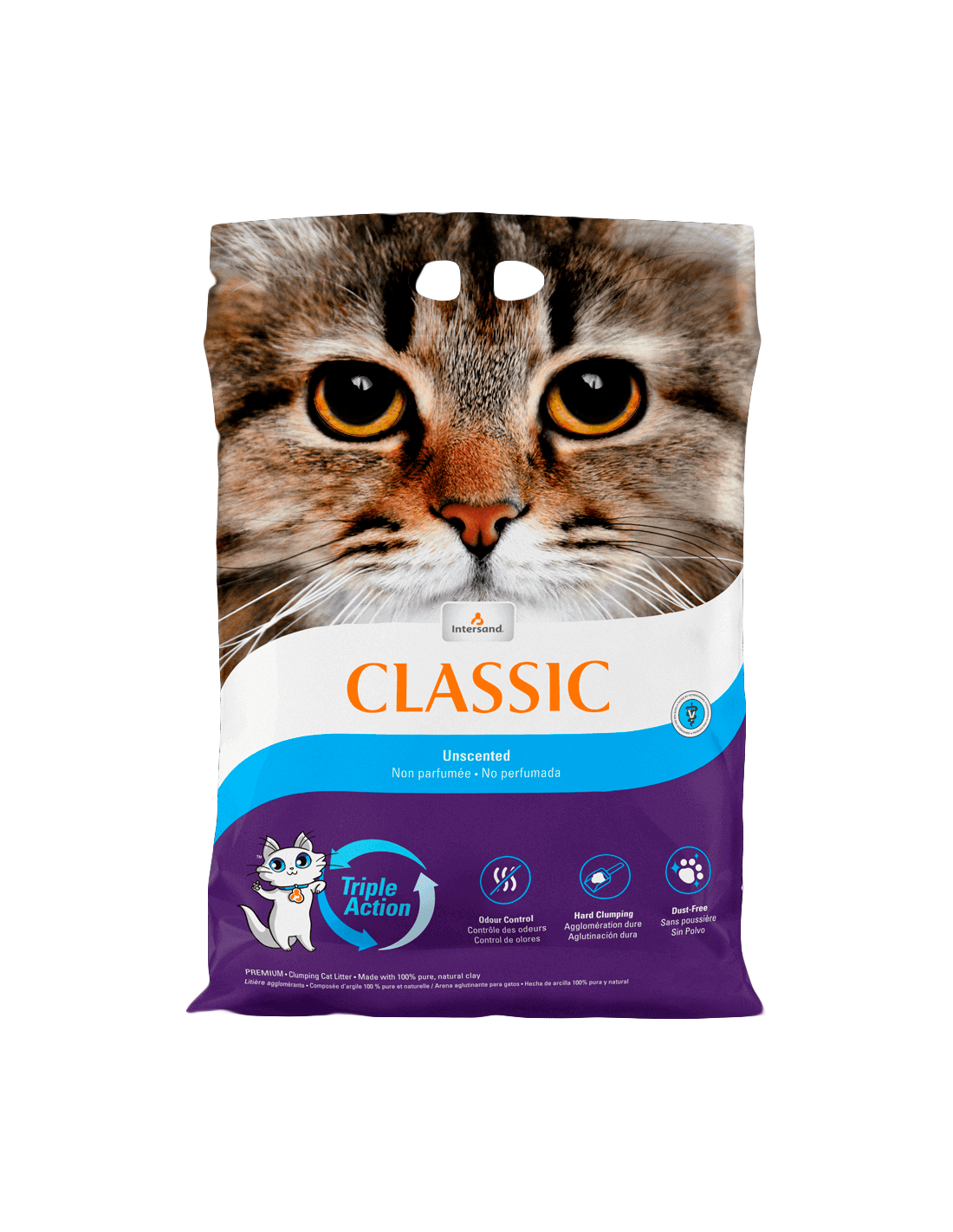 Intersand Classic Natural és una sorra aglomerant premium 100% natural i pura, procedent del Canadà, sense olor i lliure de pols. Ideal per a gats i propietaris sensibles, ofereix una higiene excepcional a la safata de sorra gràcies a la seva alta absorció i la fórmula TRIPLE ACTION™ per neutralitzar les males olors.