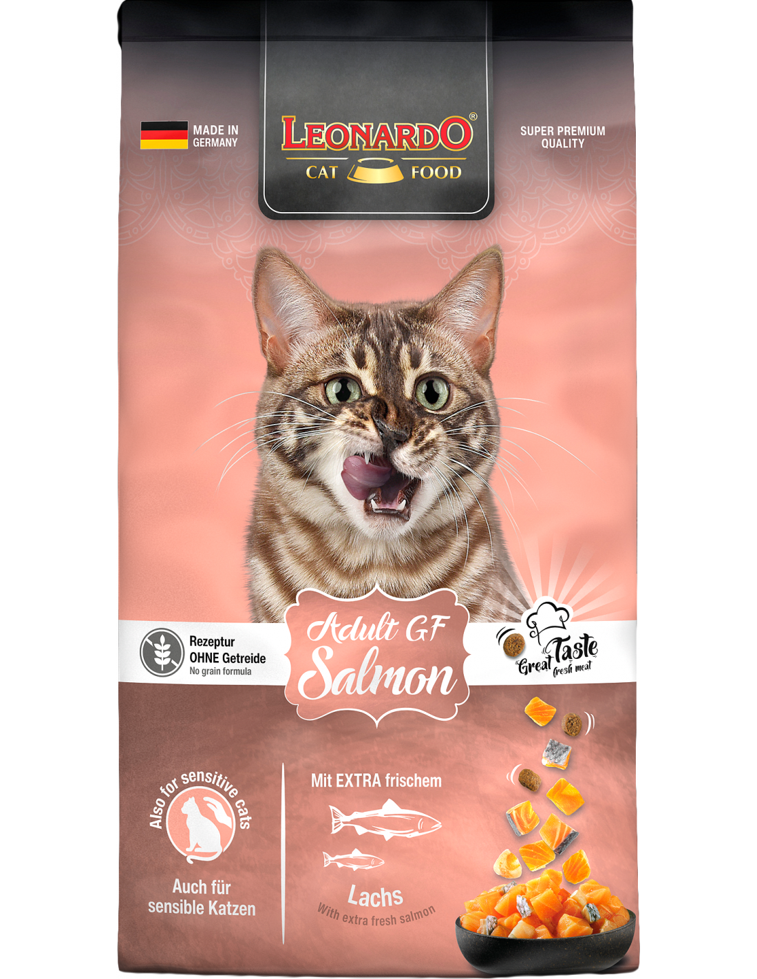 LEONARDO Adult GF Salmon ha estat desenvolupat específicament per a gats amb intoleràncies alimentàries o tendència a patir al·lèrgies. Aquesta recepta no conté gluten ni cereals, substituint-los per l'amarant, ric en nutrients. És una opció saborosa amb salmó fresc per als veritables fans del peix.