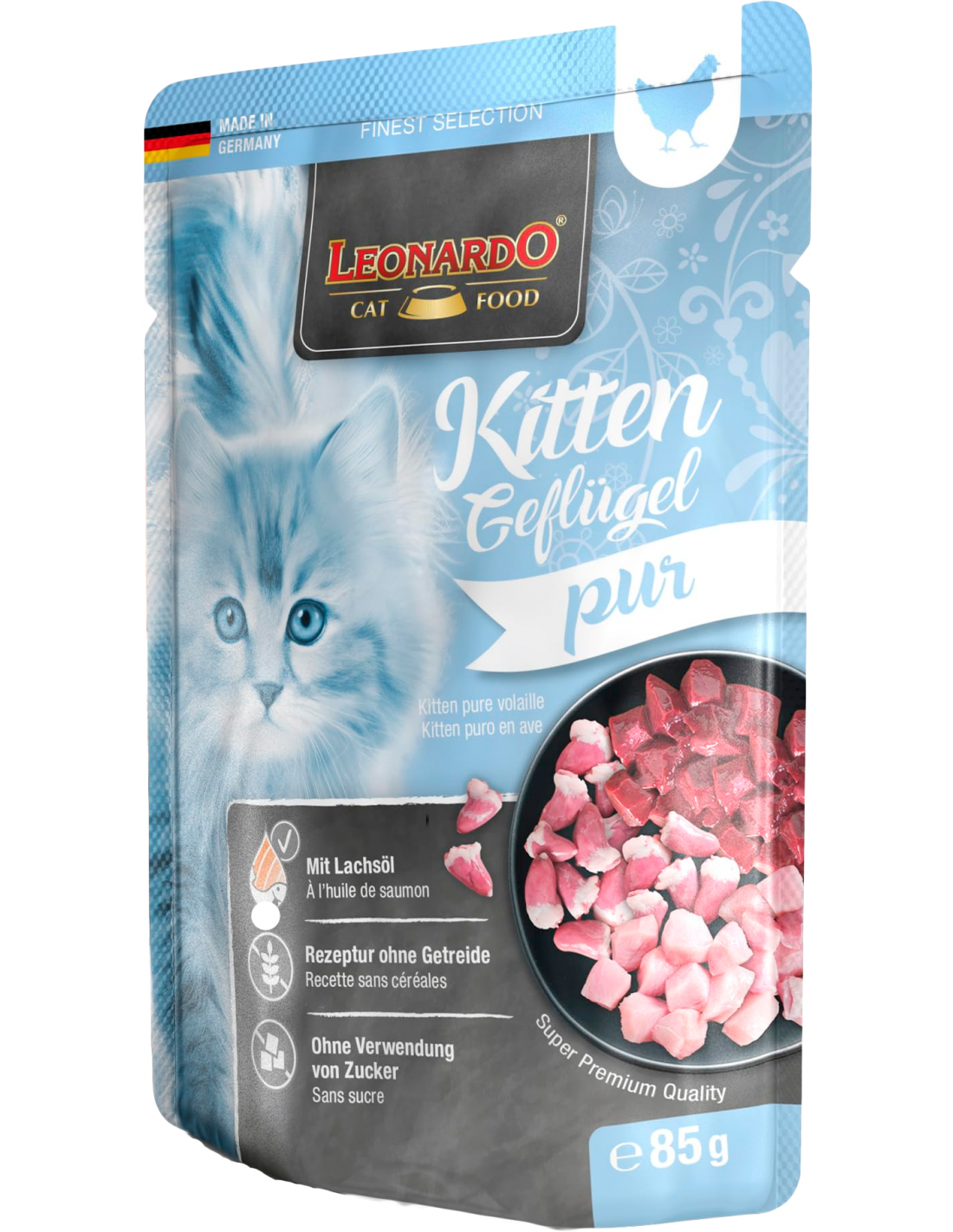 LEONARDO Kitten pur en Au és una recepta de gran qualitat especialment adaptada als gatets petits. Rica en carn d'au i vísceres, és fàcil de digerir i ofereix tot el que el teu gatet necessita per començar la seva vida amb bon peu. Conté oli de salmó que aporta àcids grassos poliinsaturats.