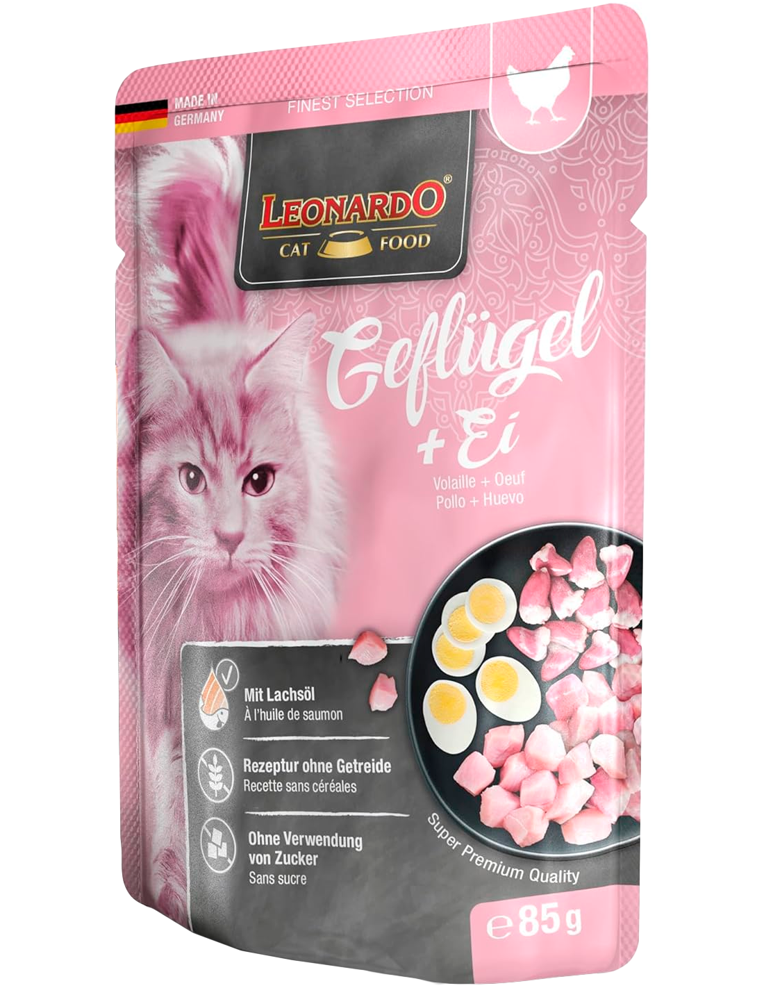 LEONARDO Pollastre + Ou és una deliciosa combinació gurmet de carn d'au tendra i baixa en greixos, i ou, oferint valuoses fonts d'energia per a una dieta equilibrada. Aquesta varietat, enriquida amb deliciosa carn de vedella, és un autèntic festí per als gats adults. A més, l'oli de salmó afavoreix un pelatge sa i brillant.