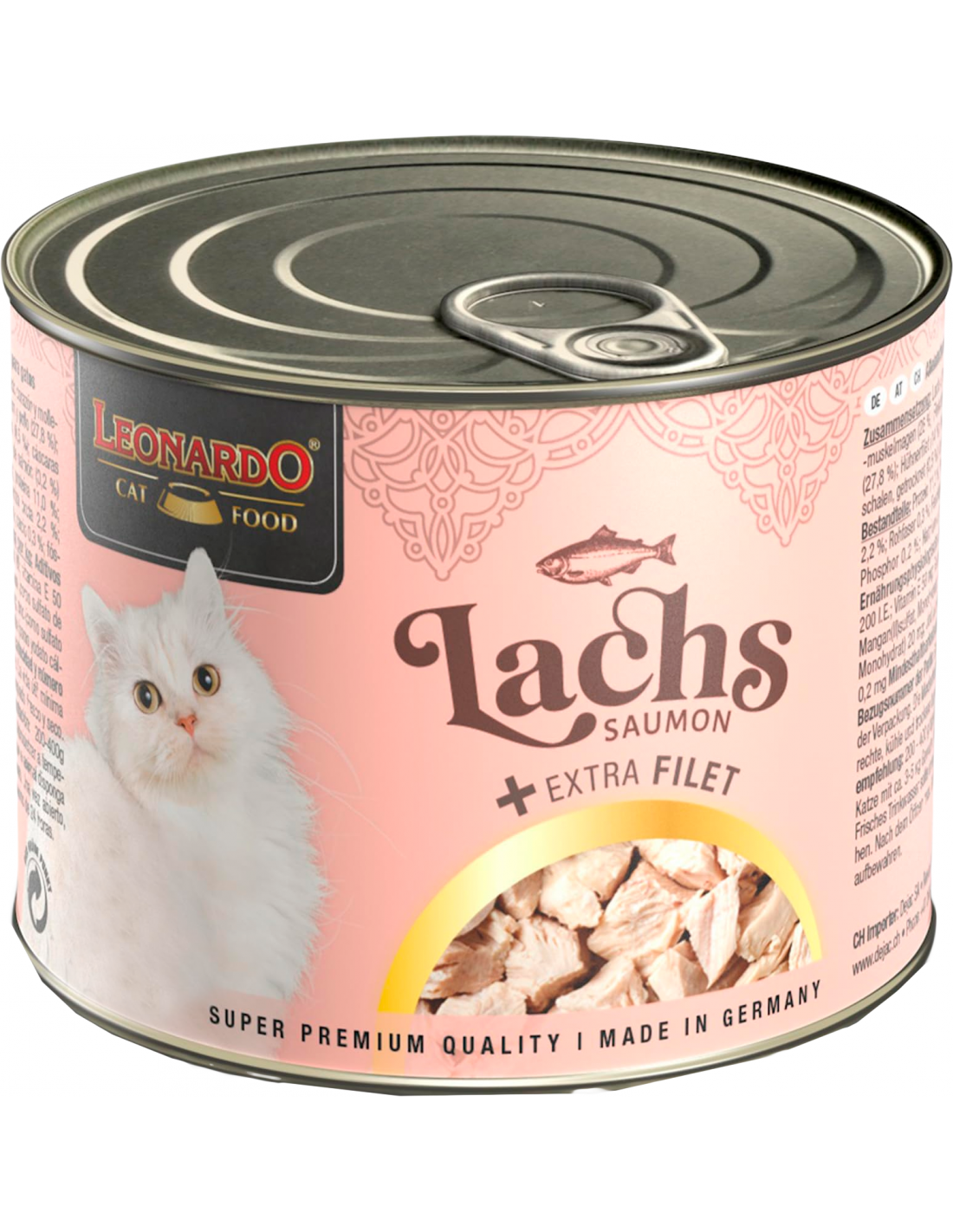 El nostre deliciós menú LEONARDO Salmó + extra filet és ideal per a tots els amants del peix. Conté jugós salmó enriquit amb pollastre i trossos de filet extra deliciosos. Cuinada suaument en el seu propi suc, aquesta irresistible delícia de carn amb una experiència de masticació especial inclou oli de salmó per a un pelatge sedós.