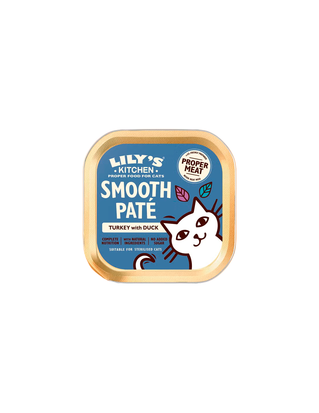 El Lily's Kitchen Cat Smooth Paté Gall Dindi amb Ànec és un clàssic aliment humit per a gats adults a partir de 4 mesos. La seva textura suau i delicada, amb un 65% de gall dindi i ànec, està elaborada amb ingredients naturals de veritat, sense sucres afegits ni cereals, i ofereix una nutrició completa i equilibrada.