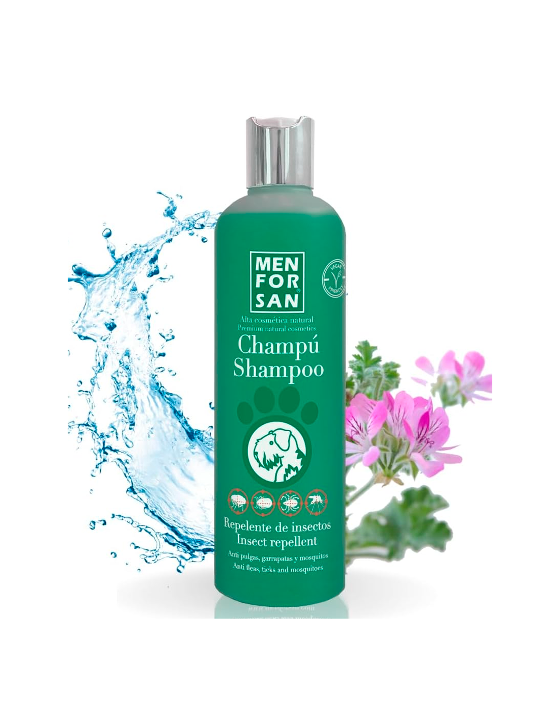 MenForSan Xampú Repel·lent d'Insectes és un xampú per a gossos amb repel·lents naturals molt efectius, com el geraniol. Protegeix i elimina durant el rentat puces, paparres, àcars i polls, i prevé posteriorment les picades de mosquits. El seu pH neutre i tensioactius suaus el fan apte per a ús freqüent en tot tipus de races.